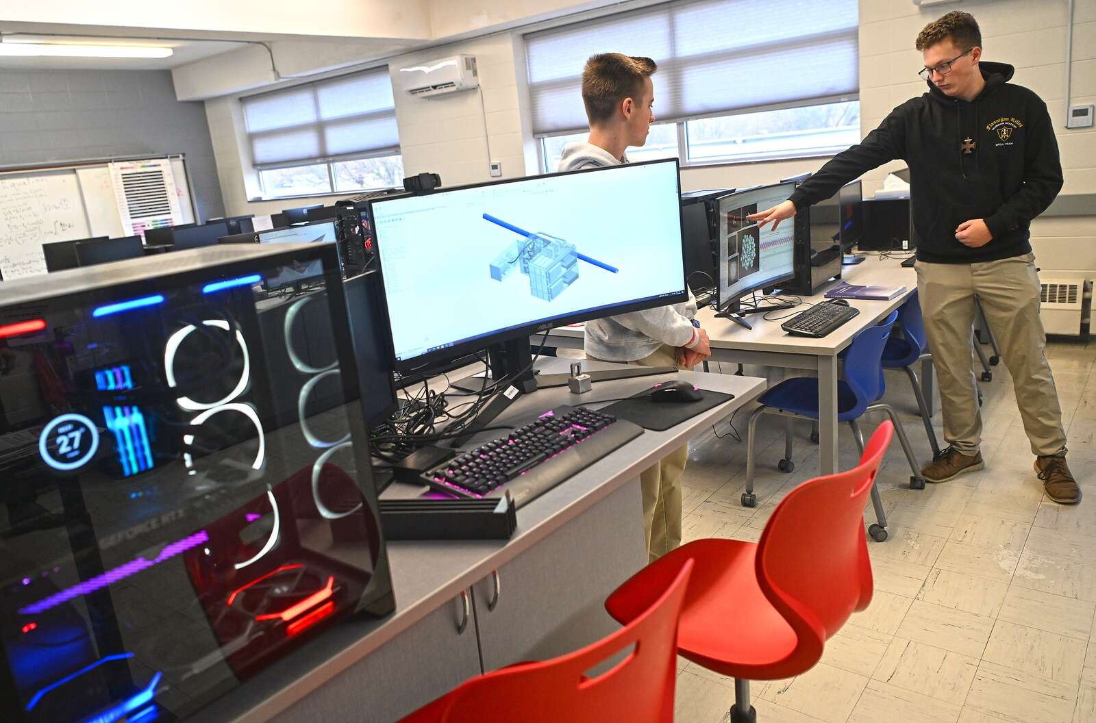 The future will include girls engaging in all aspects of Marmion, including the engineering program. Inside a lab, seniors Aidan Baer and Henry Medernach worked on hypersonic drone and molecular modeling projects, respectively.