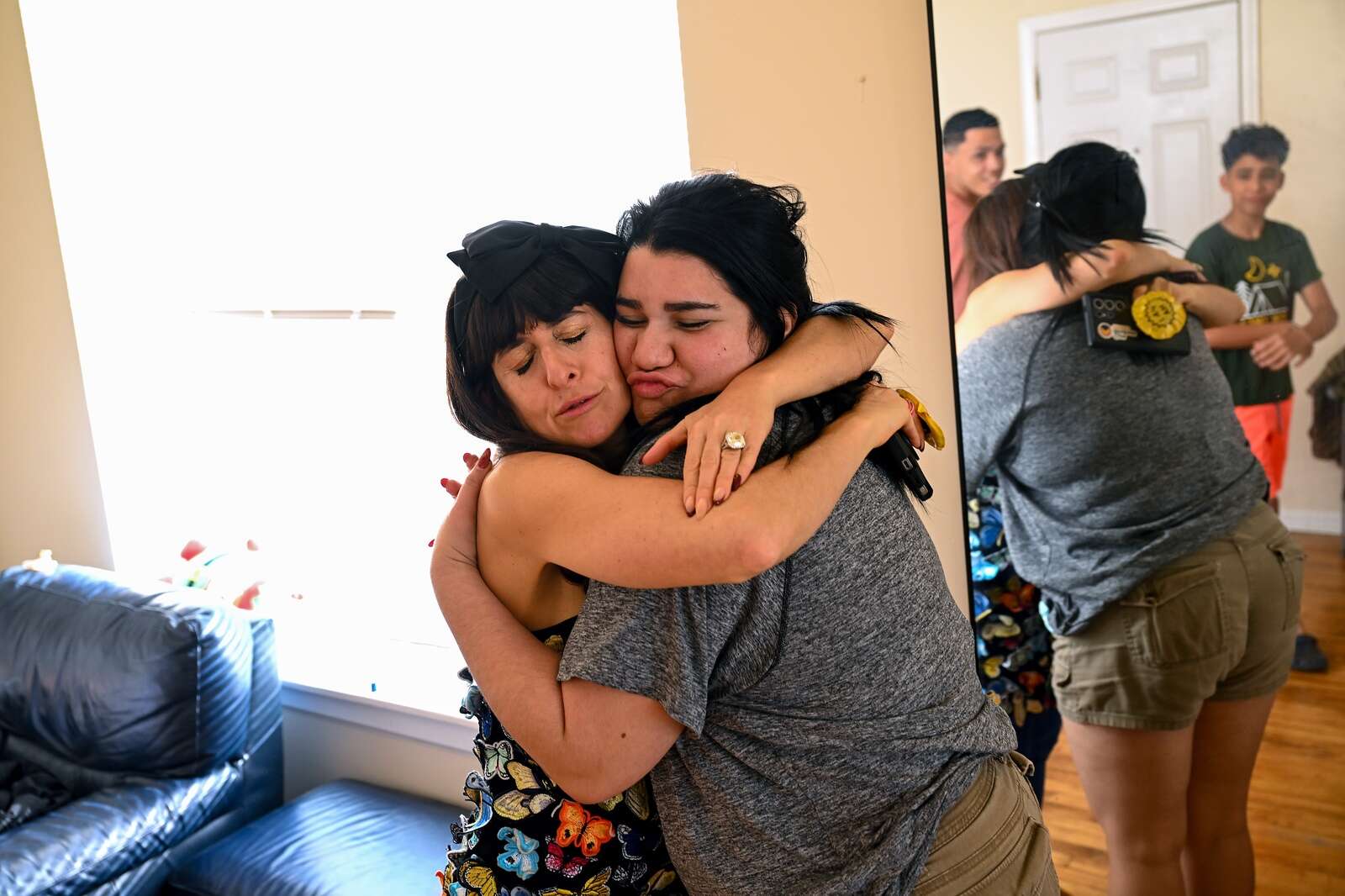 Aleah Arundale, left hugs Venezuelan immigrant Elina Diaz at her apartment Nov. 18 in Chicago. Arundale is helping Diaz and her family get to the airport as they plan to self deport back to Venezuela. Joshua Lott/The Washington Post