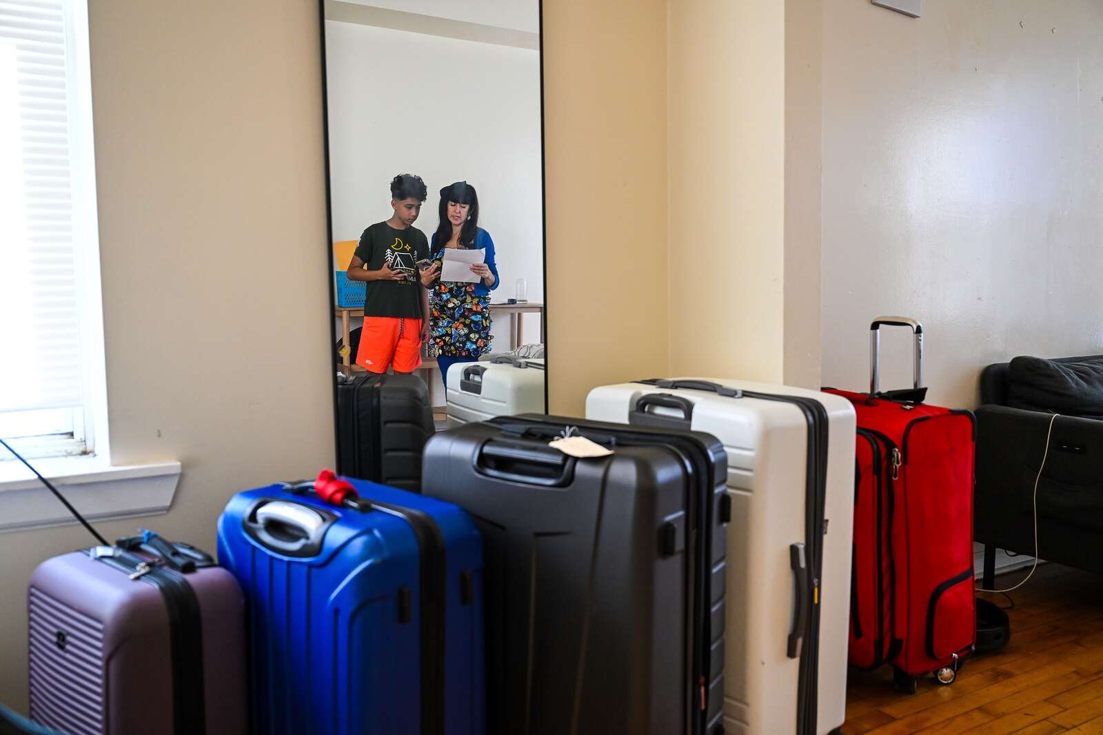 Aleah Arundale, right talks with Venezuelan immigrant Jesus Coronado as they are reflected in a mirror while packed luggage sits in the living room of an apartment in Chicago. Arundale is helping Coronado and his family get to the airport tomorrow as they plan to self deport back to Venezuela. Joshua Lott/The Washington Post