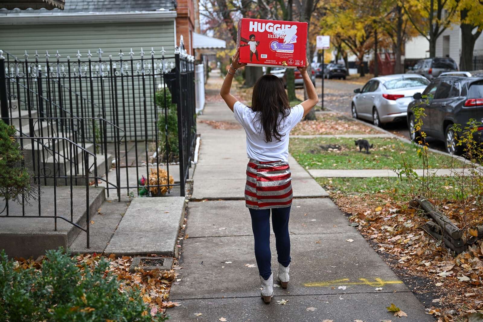 Aleah Arundale holds a box of diapers to be donated to an immigrant mother and her child on Nov. 18 in Chicago. Over the past two years Arudale started helping immigrant families after Venezuelan immigrants arrived in her neighborhood 2 years ago in the winter, arriving on bus from Texas with no where to go and without the proper clothing. Joshua Lott/The Washington Post