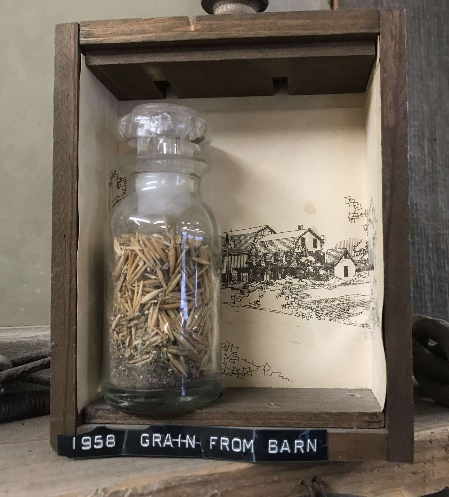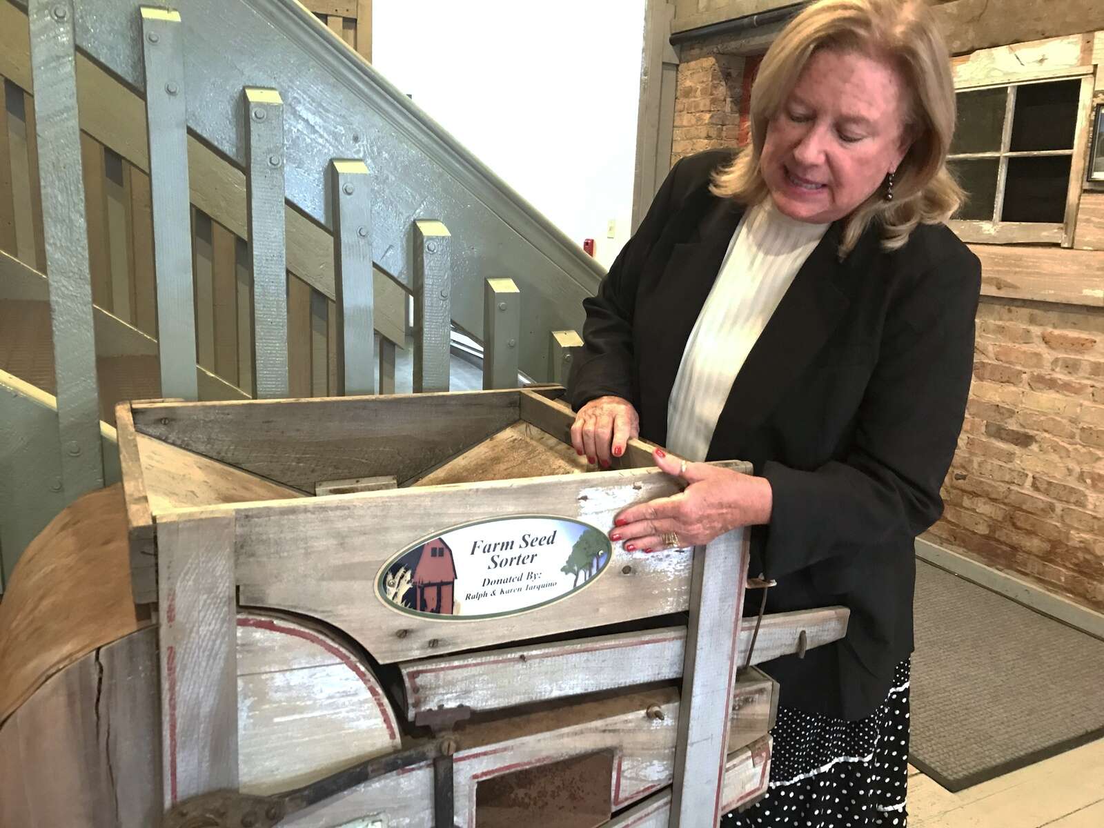 Bits of the area’s agricultural past, such as a bench of barnwood with wagon wheels as armrests, a seed sorter that still works, a hand plow and more, have been donated and displayed in the village office area.