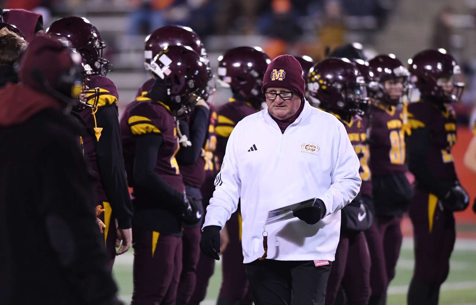 Montini head coach Mike Bukovsky gets the Broncos ready to play prior to the start of the IHSA Class 4A state championship game against Rochester on Friday, Nov. 28, 2025 in Normal.