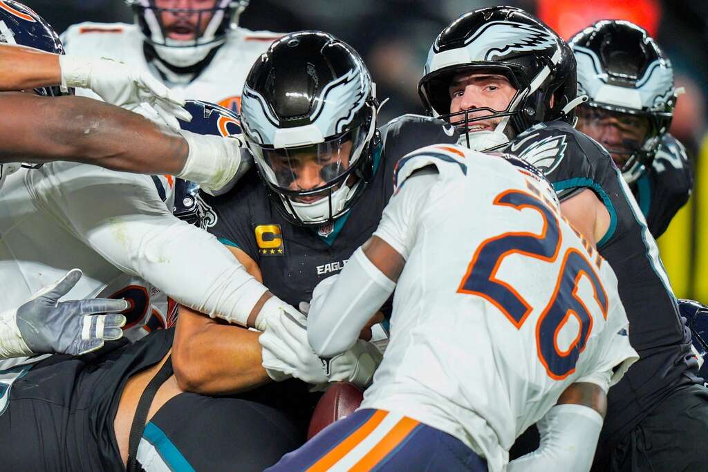 One interesting sidebar to Nahshon Wright's forced fumble on an attempted “tush push” by Hurts is the New York Giants pulled off a very similar play a few weeks ago against the Eagles, but officials ruled Hurts' forward progress was already stopped (it wasn't). The Giants ended up firing their coach, while the Bears are No. 1 in the NFC. Luck does play a part. …