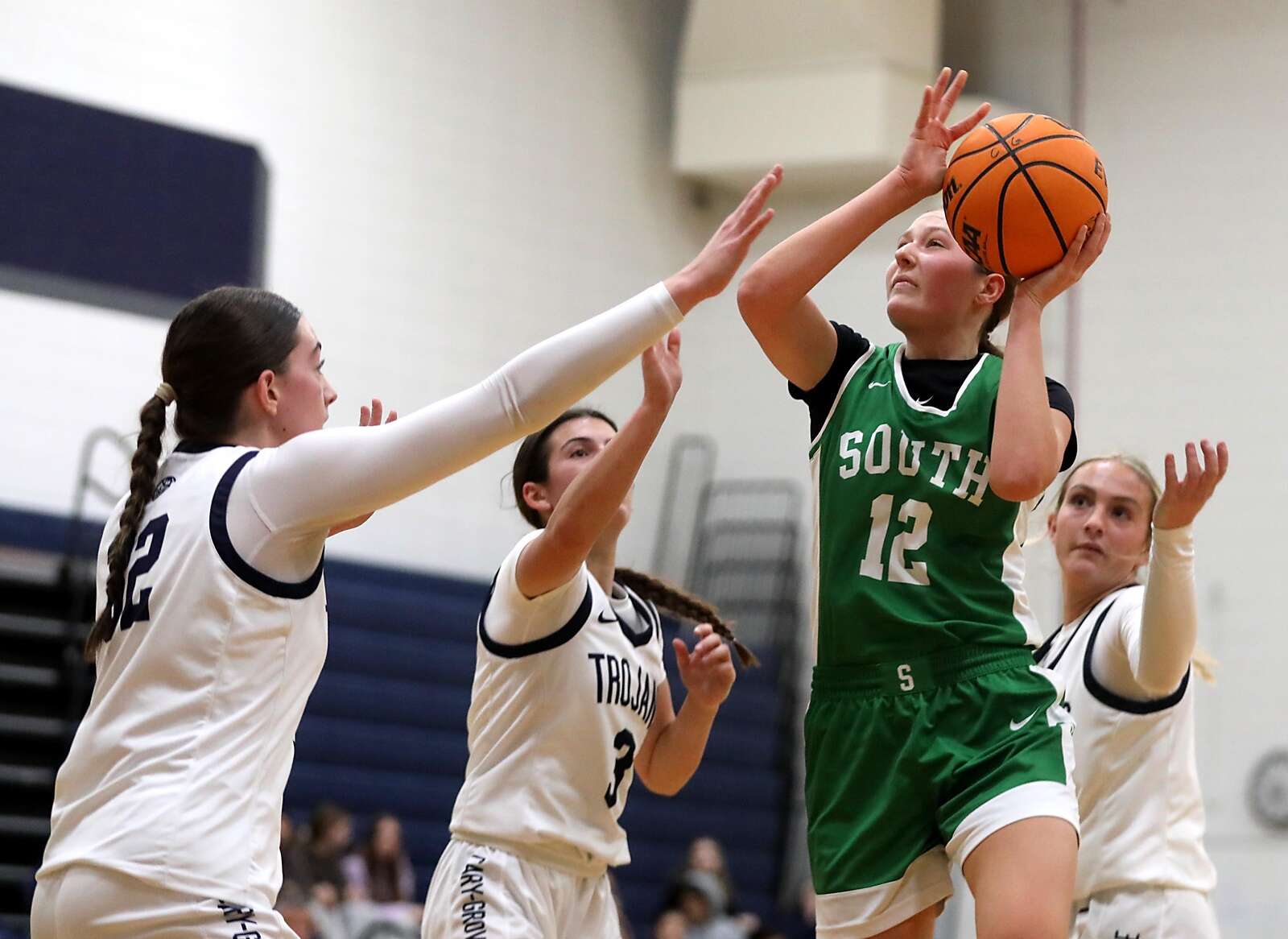 Crystal Lake South led 22-13 after a defensive first half in which both sides battled for rebounds on both ends of the floor. Although the Gators navigated around Cary-Grove’s three-quarter-court pressure, the Trojans succeeded in closing out possessions with rebounds, as Crystal Lake South struggled to hit 3-point shots.