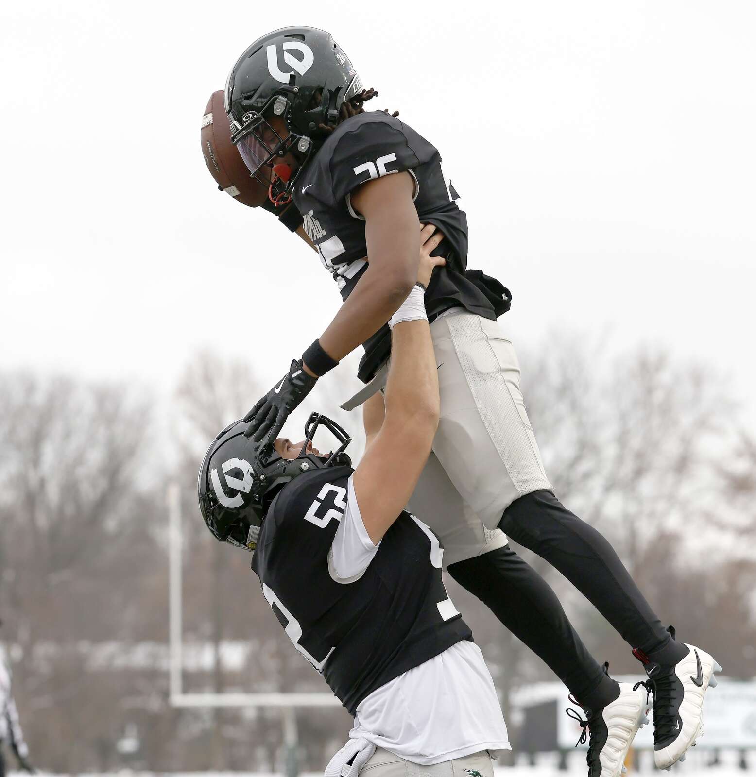 College of DuPage's Aj Moore (26) is hoisted in the air by Nick Cairo (52) after his touchdown during the NJCAA Division III National Championship football game between College of DuPage and North Dakota State College of Science Saturday, Dec. 6, 2025 at Bjarne Ullsvik Stadium in Glen Ellyn. Brian Hill/bhill@dailyherald.com