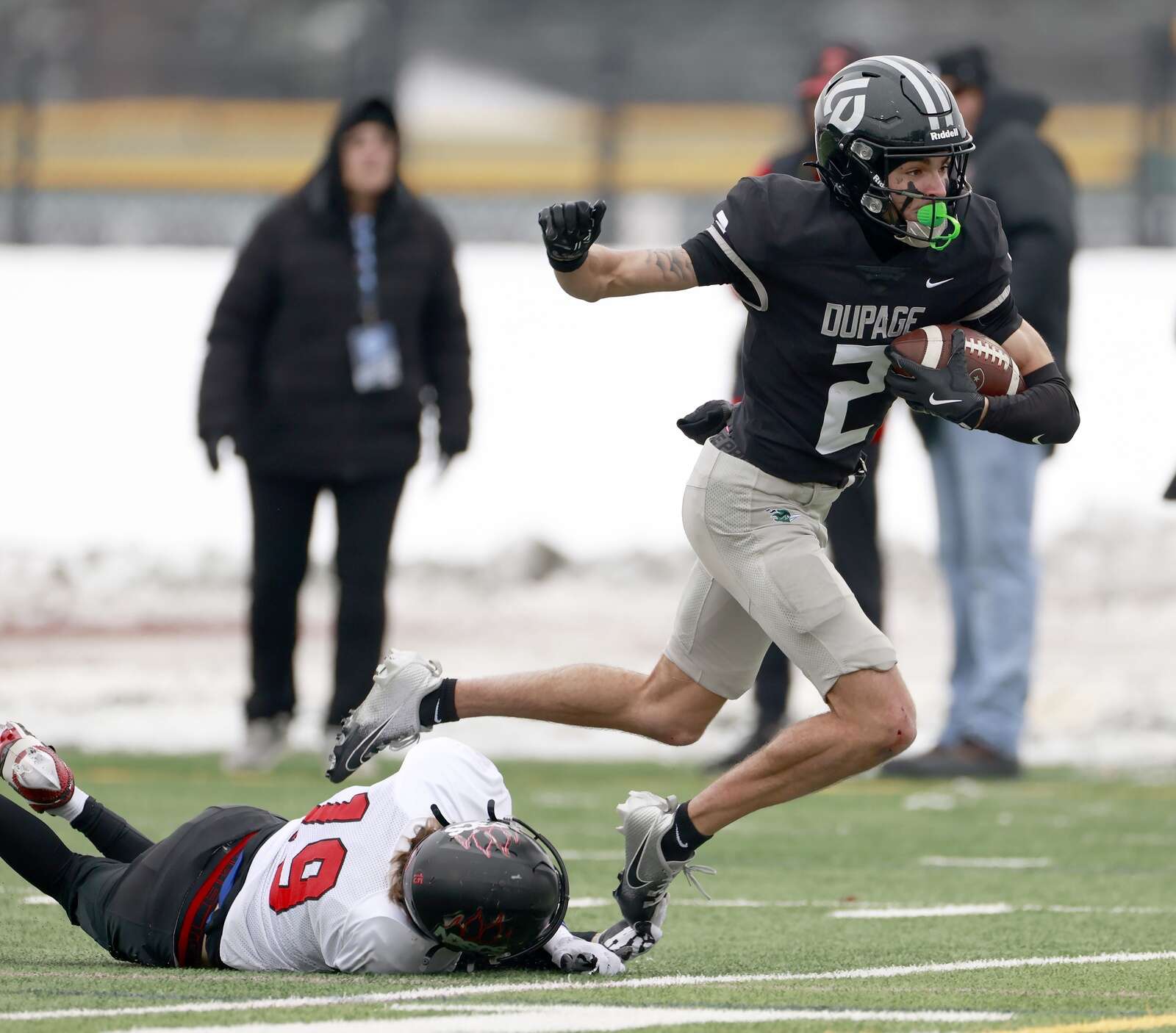 College of DuPage's Ty Carlson (2) moves to slide around a North Dakota State College of Science player after making a reception during the NJCAA Division III National Championship football game between College of DuPage and North Dakota State College of Science Saturday, Dec. 6, 2025 at Bjarne Ullsvik Stadium in Glen Ellyn. Brian Hill/bhill@dailyherald.com