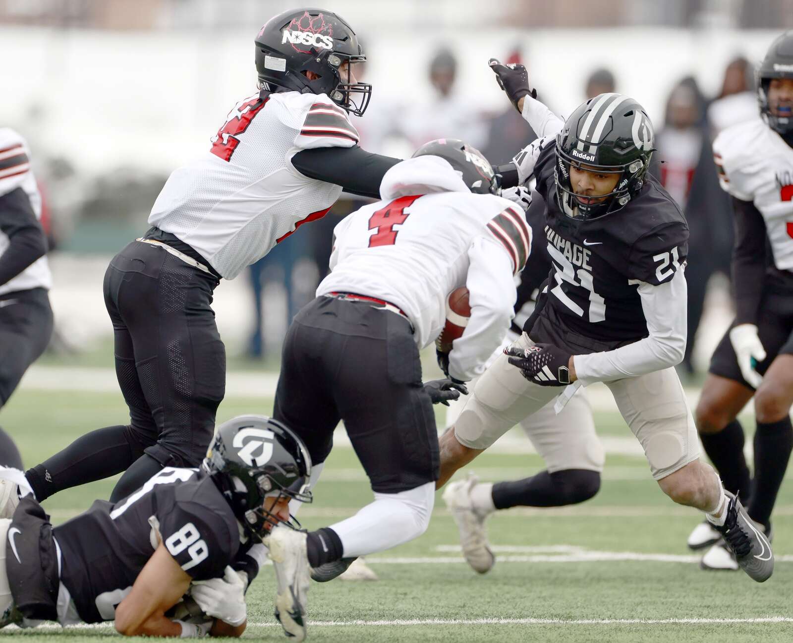 College of DuPage's James Penley (89) and Cy Charles (21) try to bring down North Dakota State College of Science's Tellise Clark Jr. (4) during the NJCAA Division III National Championship football game between College of DuPage and North Dakota State College of Science Saturday, Dec. 6, 2025 at Bjarne Ullsvik Stadium in Glen Ellyn. Brian Hill/bhill@dailyherald.com