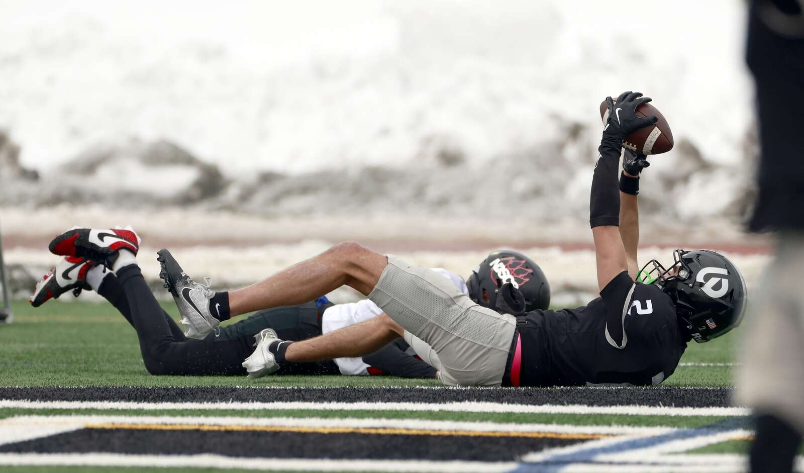 College of DuPage's Ty Carlson (2) hauls in a touchdown during the NJCAA Division III National Championship football game between College of DuPage and North Dakota State College of Science Saturday, Dec. 6, 2025 at Bjarne Ullsvik Stadium in Glen Ellyn. Brian Hill/bhill@dailyherald.com