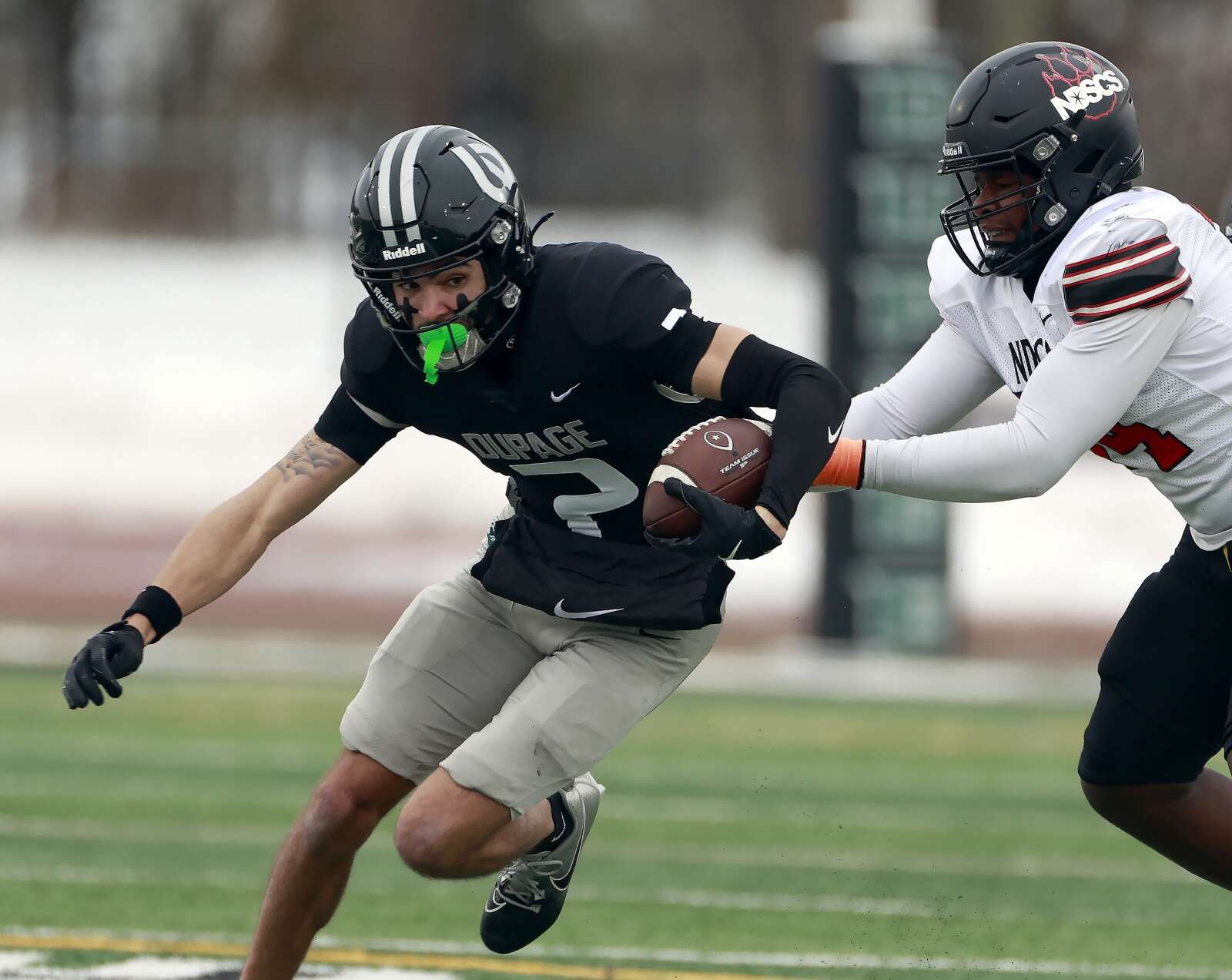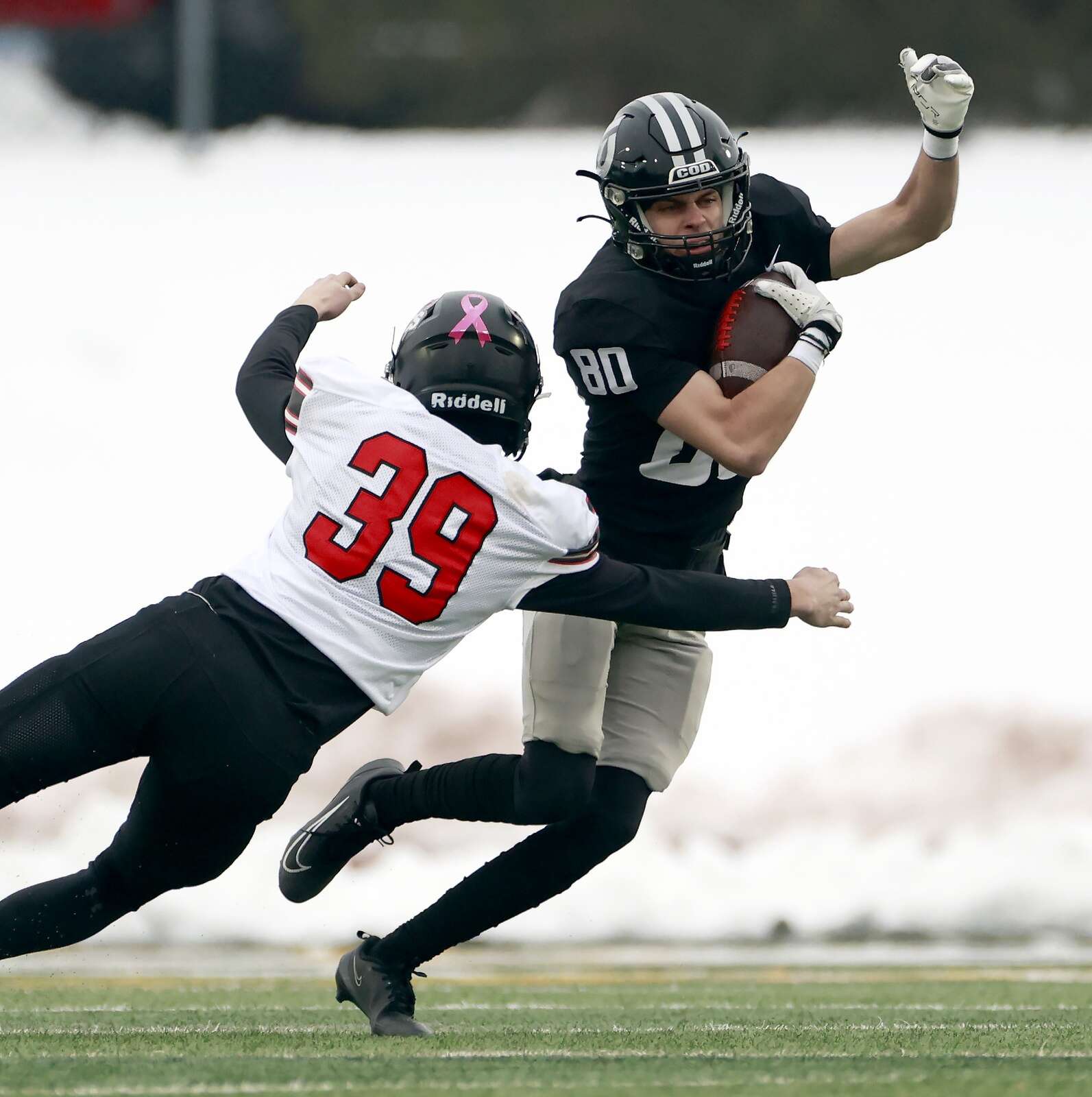 College of DuPage's Pat Pitello (80) moves to escape North Dakota State College of Science's Caleb Crow (39) during the NJCAA Division III National Championship football game between College of DuPage and North Dakota State College of Science Saturday, Dec. 6, 2025 at Bjarne Ullsvik Stadium in Glen Ellyn. Brian Hill/bhill@dailyherald.com