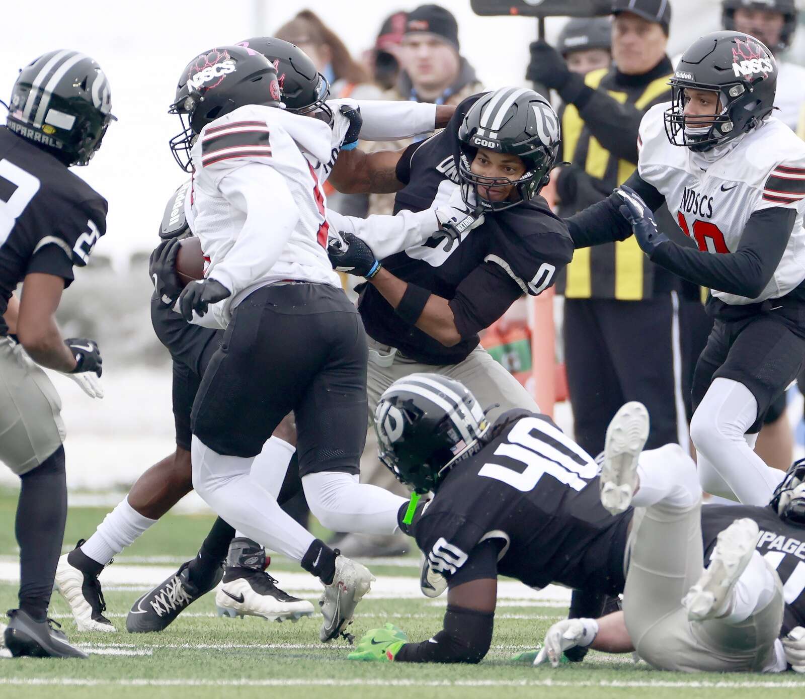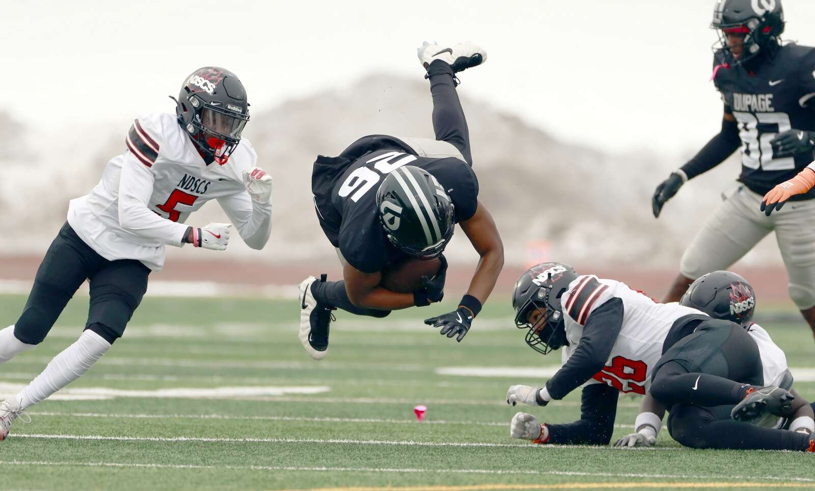 College of DuPage's Nate Foster (5) is wrapped up by a host of North Dakota State College of Science players during the NJCAA Division III National Championship football game between College of DuPage and North Dakota State College of Science Saturday, Dec. 6, 2025 at Bjarne Ullsvik Stadium in Glen Ellyn. Brian Hill/bhill@dailyherald.com
