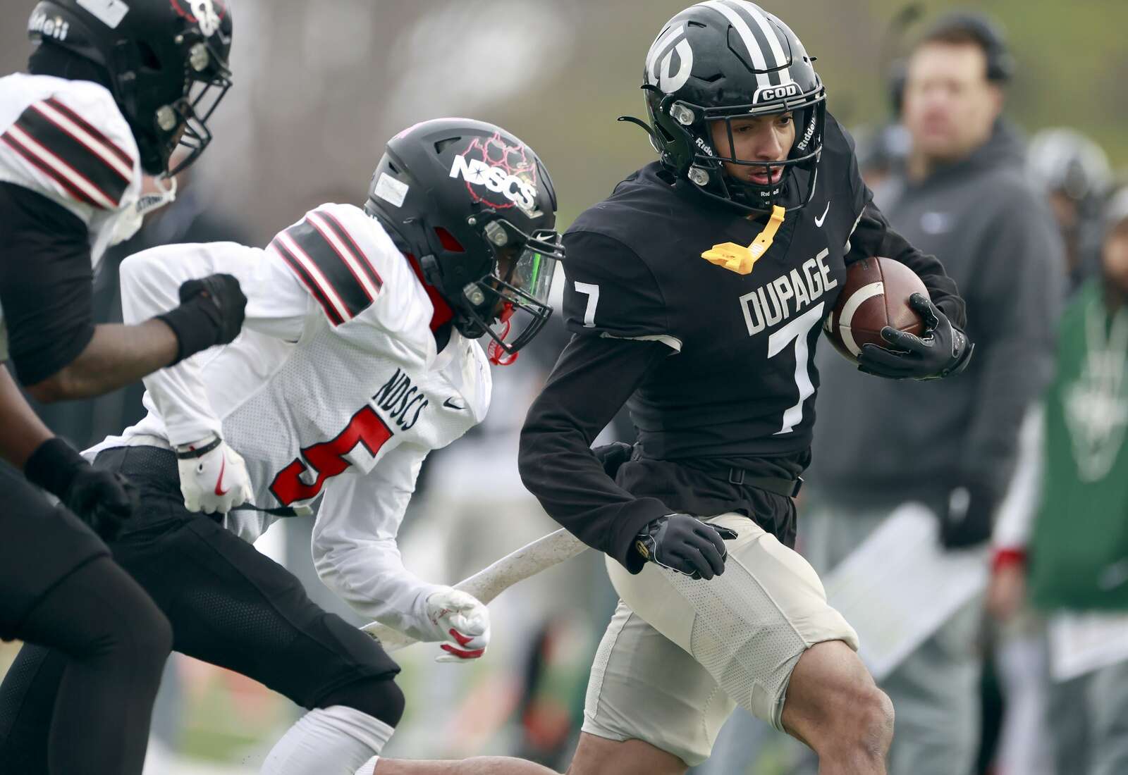 College of DuPage's Askia Bullie (7) moves the ball past North Dakota State College of Science's Daemond Gibbons (5D) during the NJCAA Division III National Championship football game between College of DuPage and North Dakota State College of Science Saturday, Dec. 6, 2025 at Bjarne Ullsvik Stadium in Glen Ellyn. Brian Hill/bhill@dailyherald.com