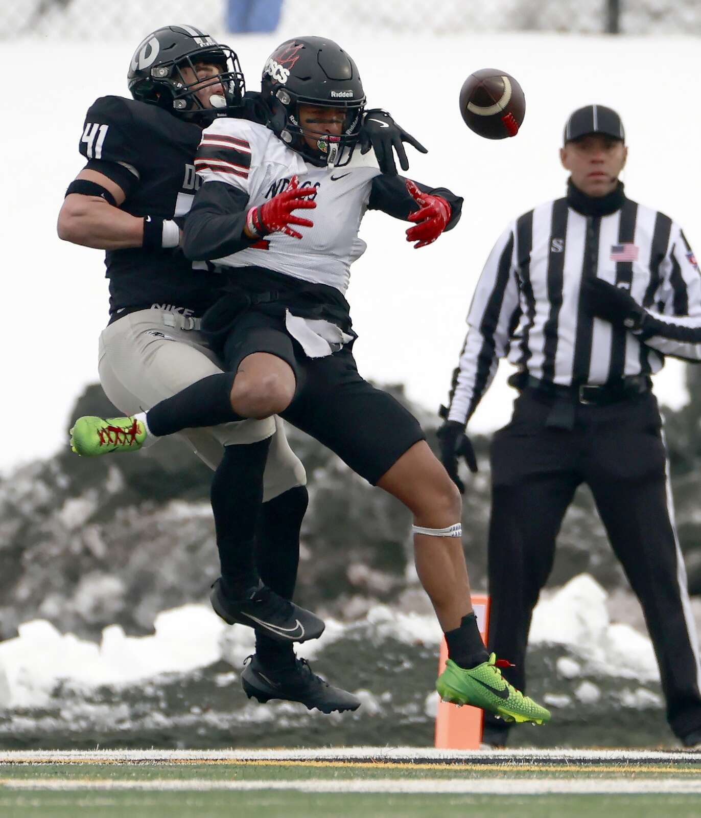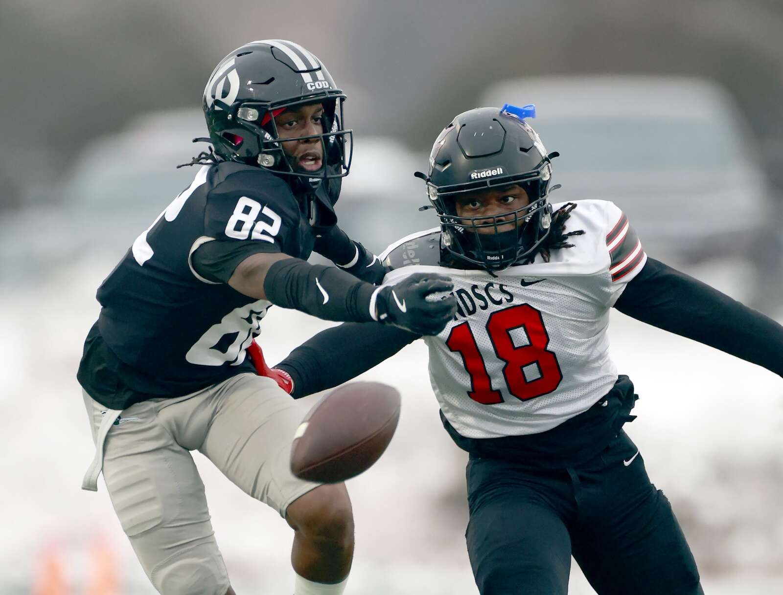 College of DuPage's Daion Gaston (82) and North Dakota State College of Science's Edward Banks (18) can’t quite reach an errant pass that fell incomplete during the NJCAA Division III National Championship football game between College of DuPage and North Dakota State College of Science Saturday, Dec. 6, 2025 at Bjarne Ullsvik Stadium in Glen Ellyn. Brian Hill/bhill@dailyherald.com