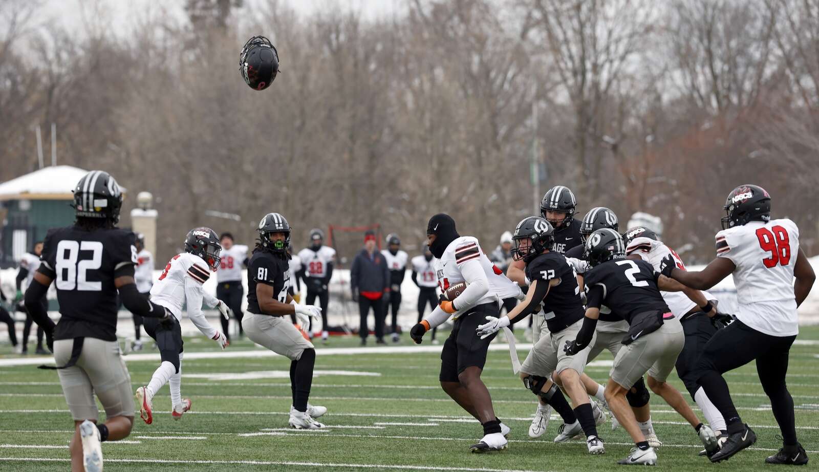 North Dakota State College of Science's Brian Smith (34) loses his helmet as he tries to avoid a host of College of DuPage players during the NJCAA Division III National Championship football game between College of DuPage and North Dakota State College of Science Saturday, Dec. 6, 2025 at Bjarne Ullsvik Stadium in Glen Ellyn. Brian Hill/bhill@dailyherald.com