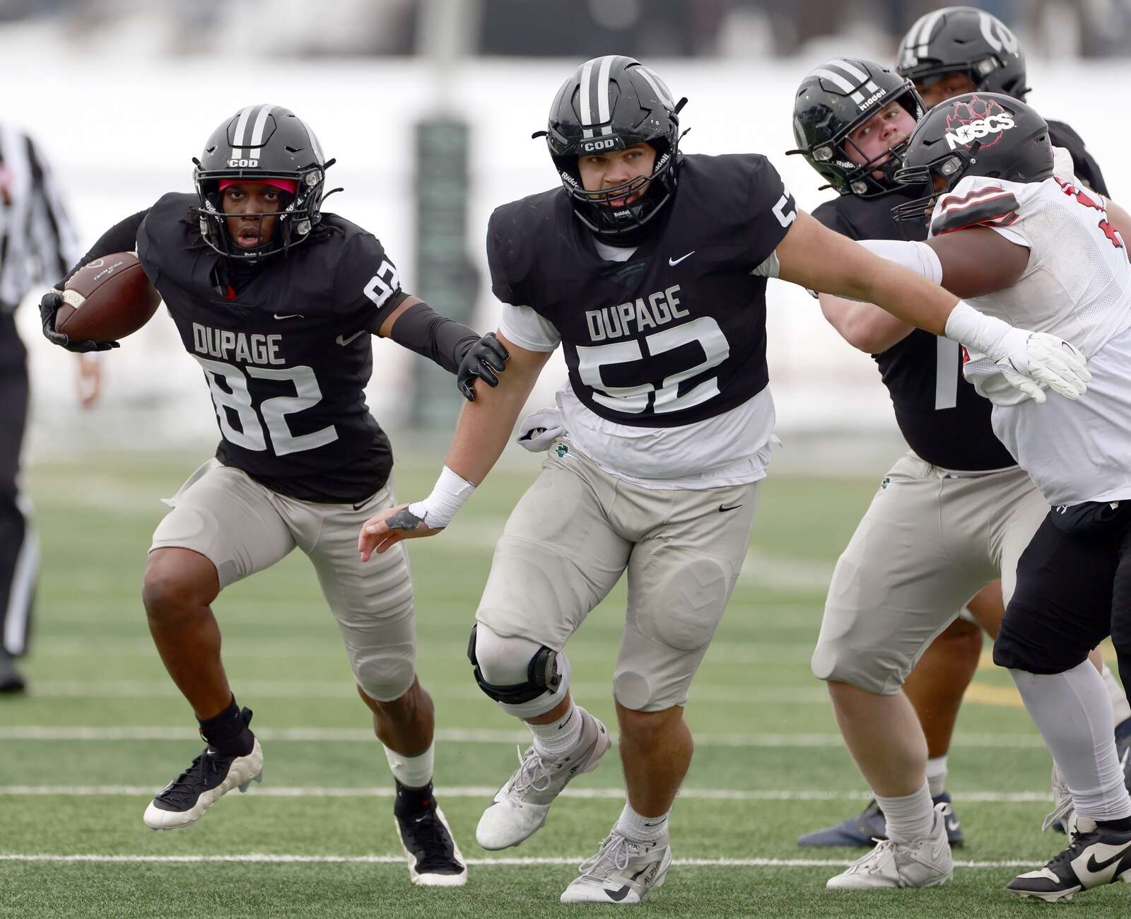 College of DuPage's Daion Gaston (82) is protected by College of DuPage's Nick Cairo (52) as he moves the ball upfield during the NJCAA Division III National Championship football game between College of DuPage and North Dakota State College of Science Saturday, Dec. 6, 2025 at Bjarne Ullsvik Stadium in Glen Ellyn. Brian Hill/bhill@dailyherald.com