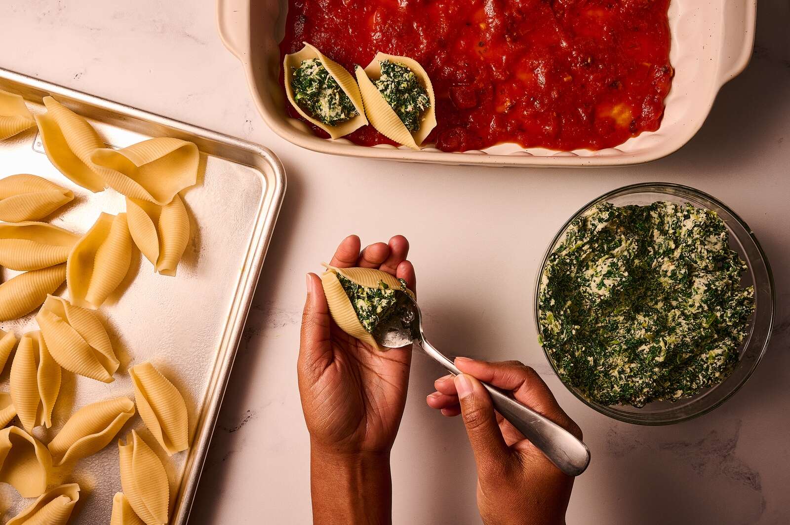 Position a rack in the middle of the oven and preheat to 350°F. Coat the bottom of a 9-by-13-by-2-inch baking dish with 1¼ cups of the sauce. Fill each shell with a generous 1 tablespoon of the filling, arranging them in the baking dish as you go. Spoon the remaining 2 cups of marinara on top, spreading into an even layer, and cover with foil.