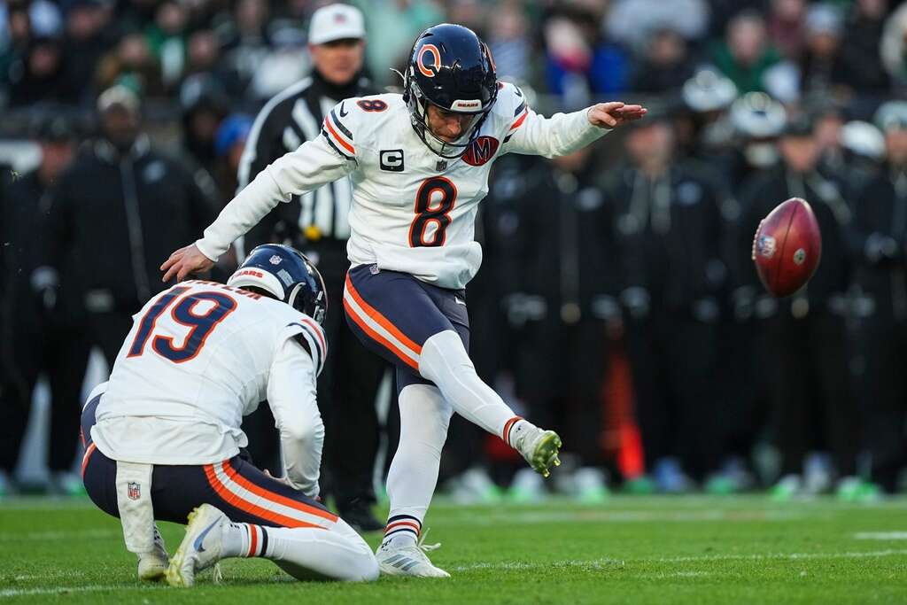 Chicago Bears place kicker Cairo Santos (8) kicks a field goal during the first half of an NFL football game against the Philadelphia Eagles, Friday, Nov. 28, 2025, in Philadelphia. (AP Photo/Matt Rourke) AP