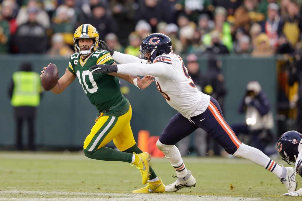 Green Bay Packers quarterback Jordan Love (10) is sacked by Chicago Bears defensive end Montez Sweat (98) during an NFL football game between the Green Bay Packers and Chicago Bears Sunday, Dec. 7, 2025, in Green Bay, Wis. (AP Photo/Matt Ludtke) AP