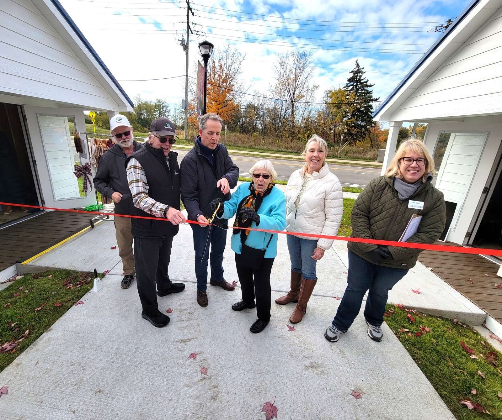 Warrenville Mayor Andy Johnson, center, helped by former mayors David Brummel and Vivian Lund, cut the ribbon for Warrenville Mercantile at Leone Schmidt Heritage Park, 28W164 Warrenville Road. Also on hand, from left are: plan commission Chairman Timothy Cosgrove, Winfield Township Supervisor Sheila Rutledge, who as a DuPage County Board member helped secure funding for Warrenville Mercantile, and the city's Community and Economic Development Director Amy Emery. The Mercantile features custom-built shop spaces for rotating local vendors in downtown Warrenville. Courtesy of city of Warrenville