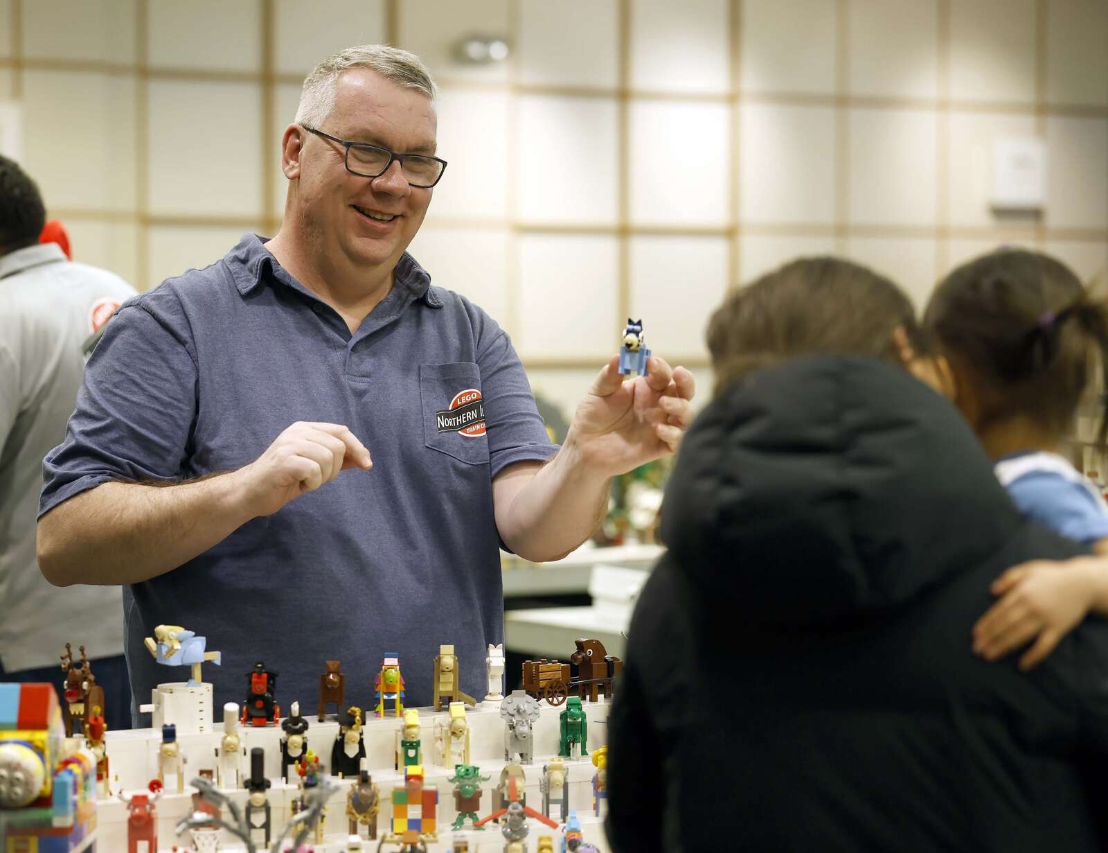 Mark Anderson of Schaumburg, vice president of the Northern Illinois Lego Train Club speaks to visitors during the club’s exhibit Saturday at the Arlington Heights Memorial Library.