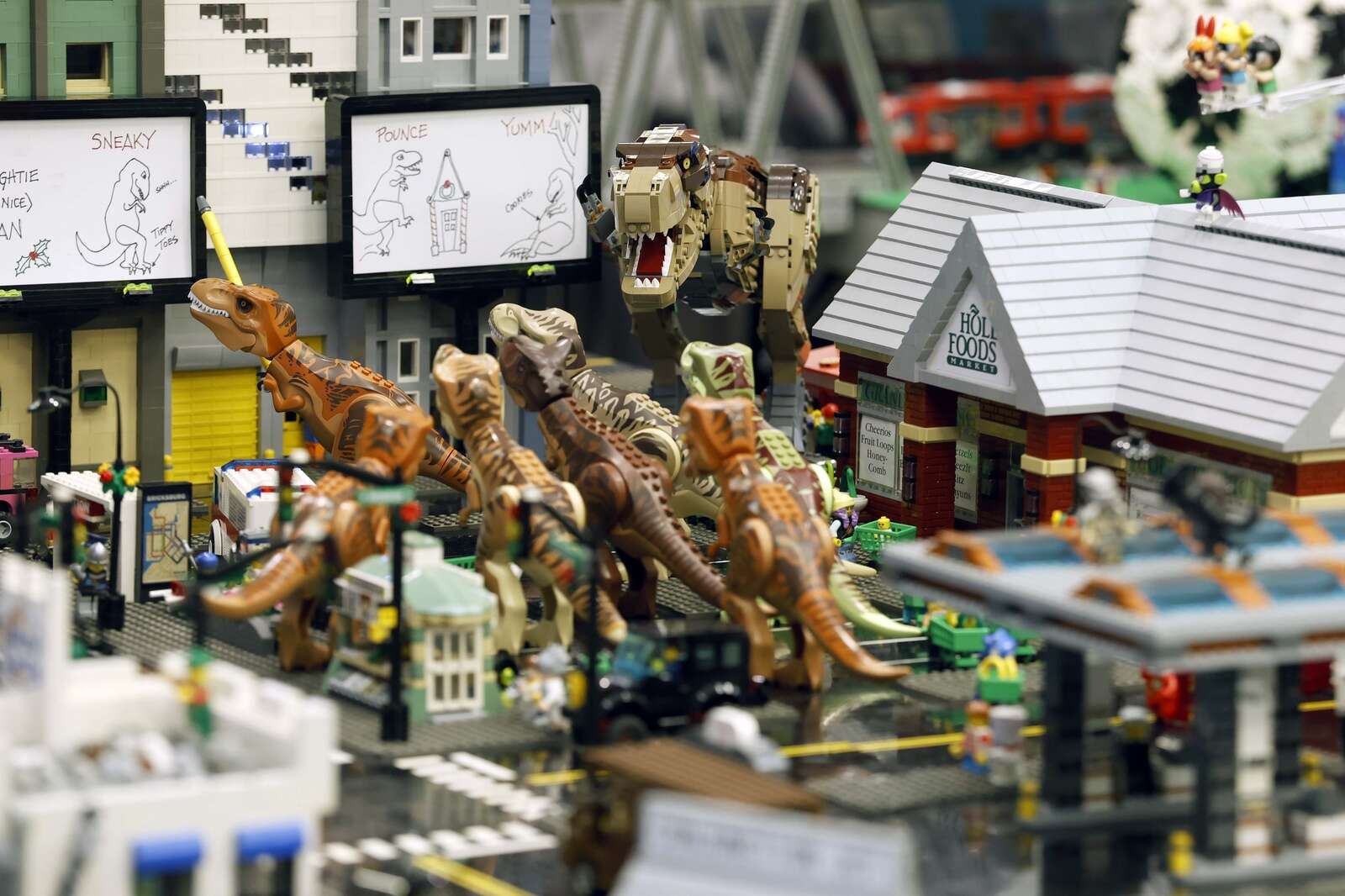A series of Lego dinosaurs are seen at the Northern Illinois Lego Train Club’s display Saturday at the Arlington Heights Memorial Library.