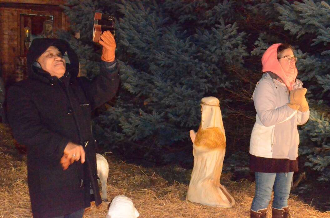 After blessing the nativity crib, Father Godwin Asuquo, left, pastor at St. Joseph Catholic Church in Aurora, photographs the audience while Lisa Hardekopf, Lehnertz Avenue Association president, welcomes visitors on Sunday, Dec. 14. Courtesy of Al Benson