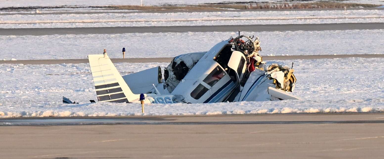 Pictures show a plane with significant front end damage in a snow-covered area near a runway.