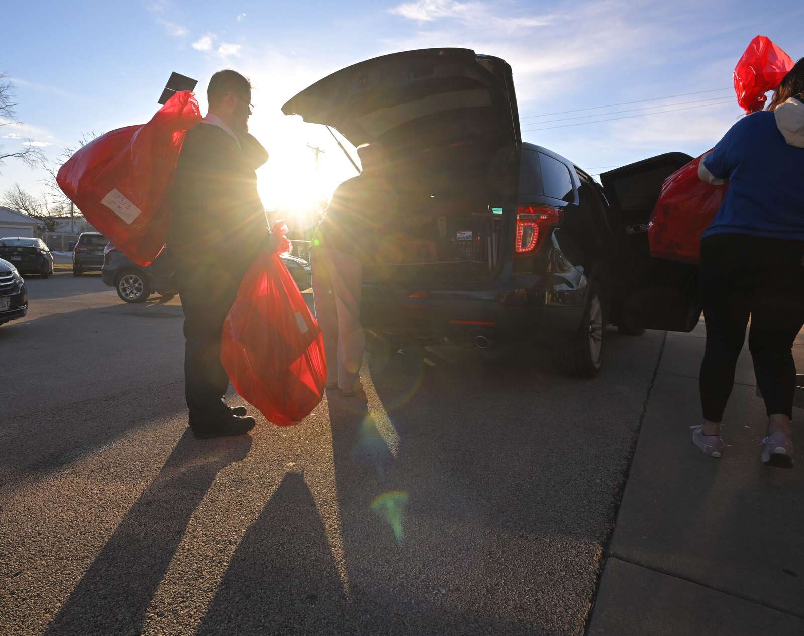 Bundled up to protect themselves against the day’s bitter wind and low temperatures, the volunteers greeted arriving parents at their cars, offered to pray with them and then loaded vehicles with large red bags containing pajamas, coats, gloves, hats, everyday clothes and toys.