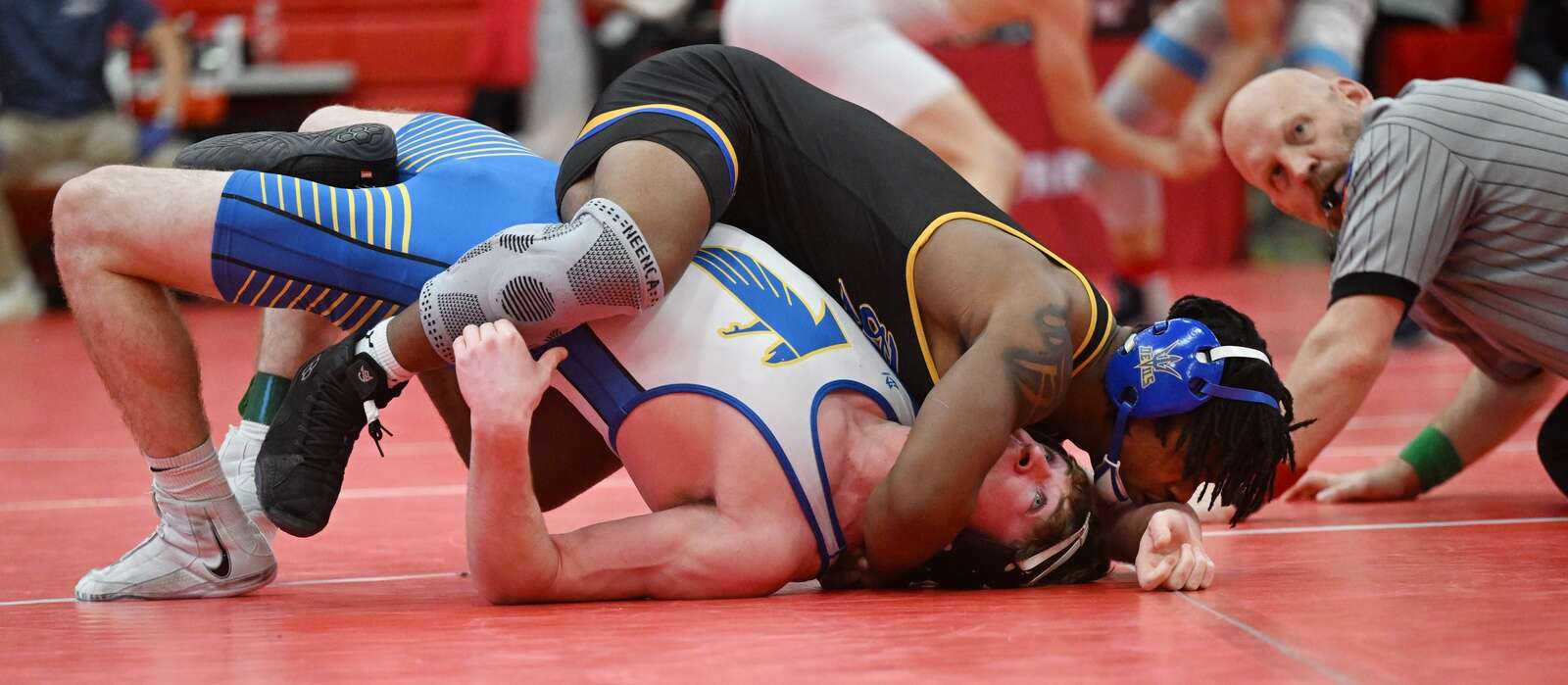 Warren’s Aaron Stewart, top, wrestles Wheaton North’s Ryan Rosch in the 190-pound final of the Rex Whitlatch Invite wrestling tournament at Hinsdale Central Saturday, Dec. 20, 2025 in Hinsdale. Joe Lewnard/jlewnard@dailyherald.com