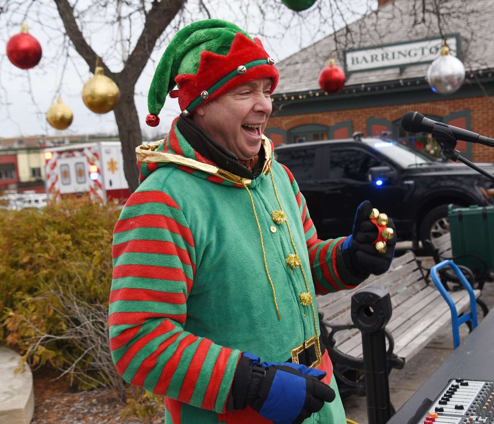 DJ Bob Roig plays festive music prior to the arrival of Operation North Pole, a holiday train trip for seriously and terminally ill children and their families, when it stopped in Barrington Saturday. Joe Lewnard/jlewnard@dailyherald.com