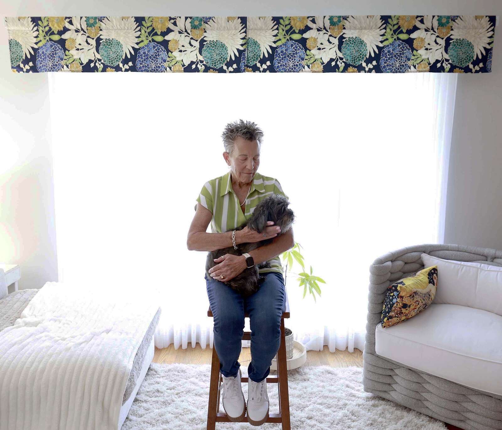 Deb Robertson holds her dog Nellie Wednesday, June 4, 2025 at her home in Lombard. Robertson has a rare form of cancer and supports medical aid in dying.