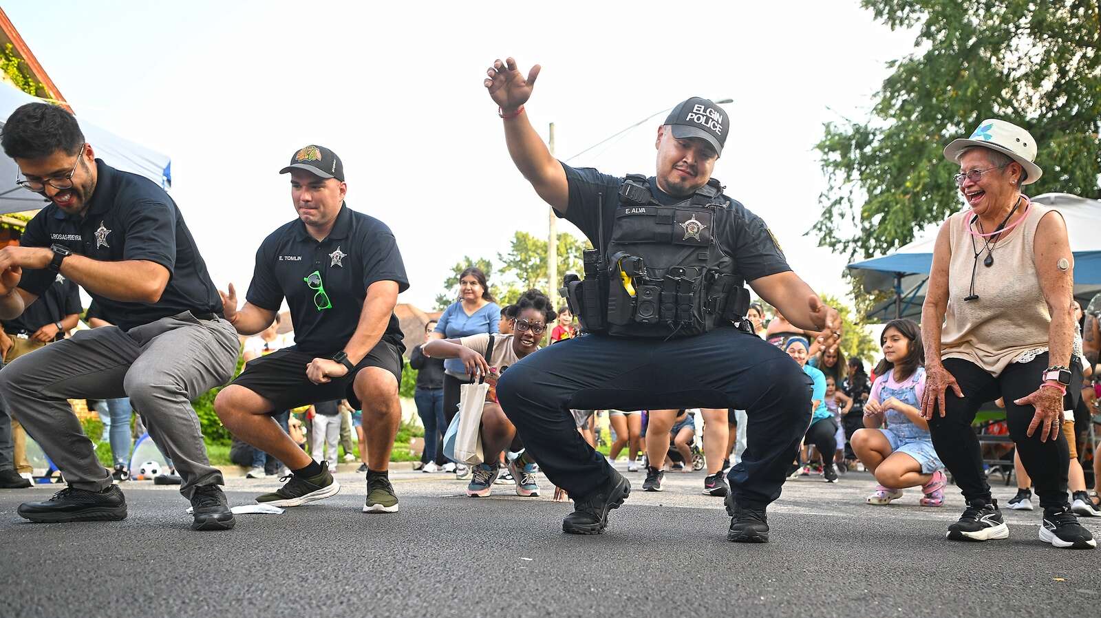 Elgin Police Officer Edwin Alva shows how low he can go, much to the delight of Celia Lopez, right, during National Night Out festivities in Elgin. The Elgin Police Department hosted eight such celebrations around the city.