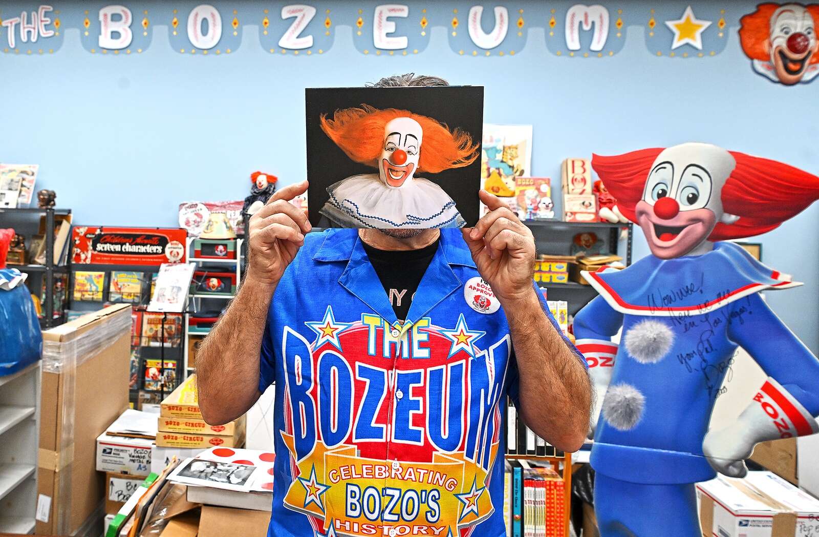 Tom Holbrook is moving his massive collection of Bozo related memorabilia to a space in downtown Elgin he’s dubbed The Bozeum. Not only is Holbrook one of the world’s most prolific collectors of Bozo memorabilia and history, he’s also portrayed him at events and trade shows as seen in the head shot he’s holding.