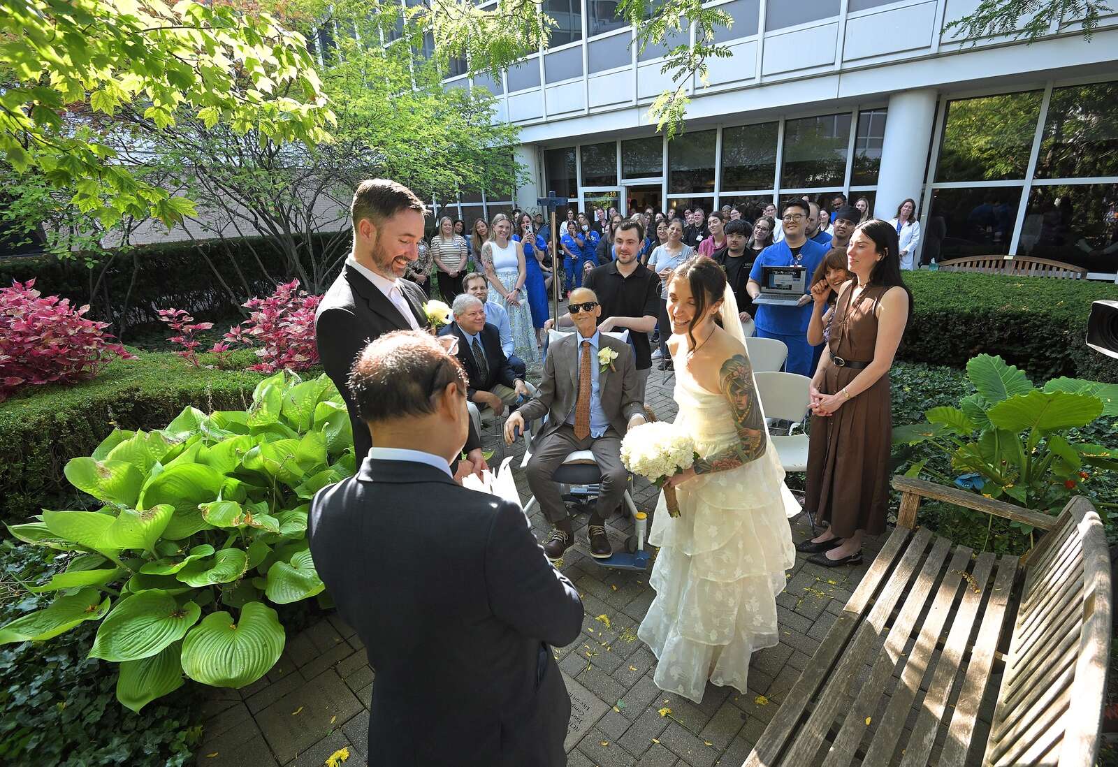 Dan Benway sits in a wheelchair as he watches his daughter Grace marry Thomas Decourcey in the butterfly garden at Northwest Community Hospital in Arlington Heights on Sept. 18, 2025. The couple moved their wedding from Colorado so her father could attend. He is being treated for pancreatic cancer.