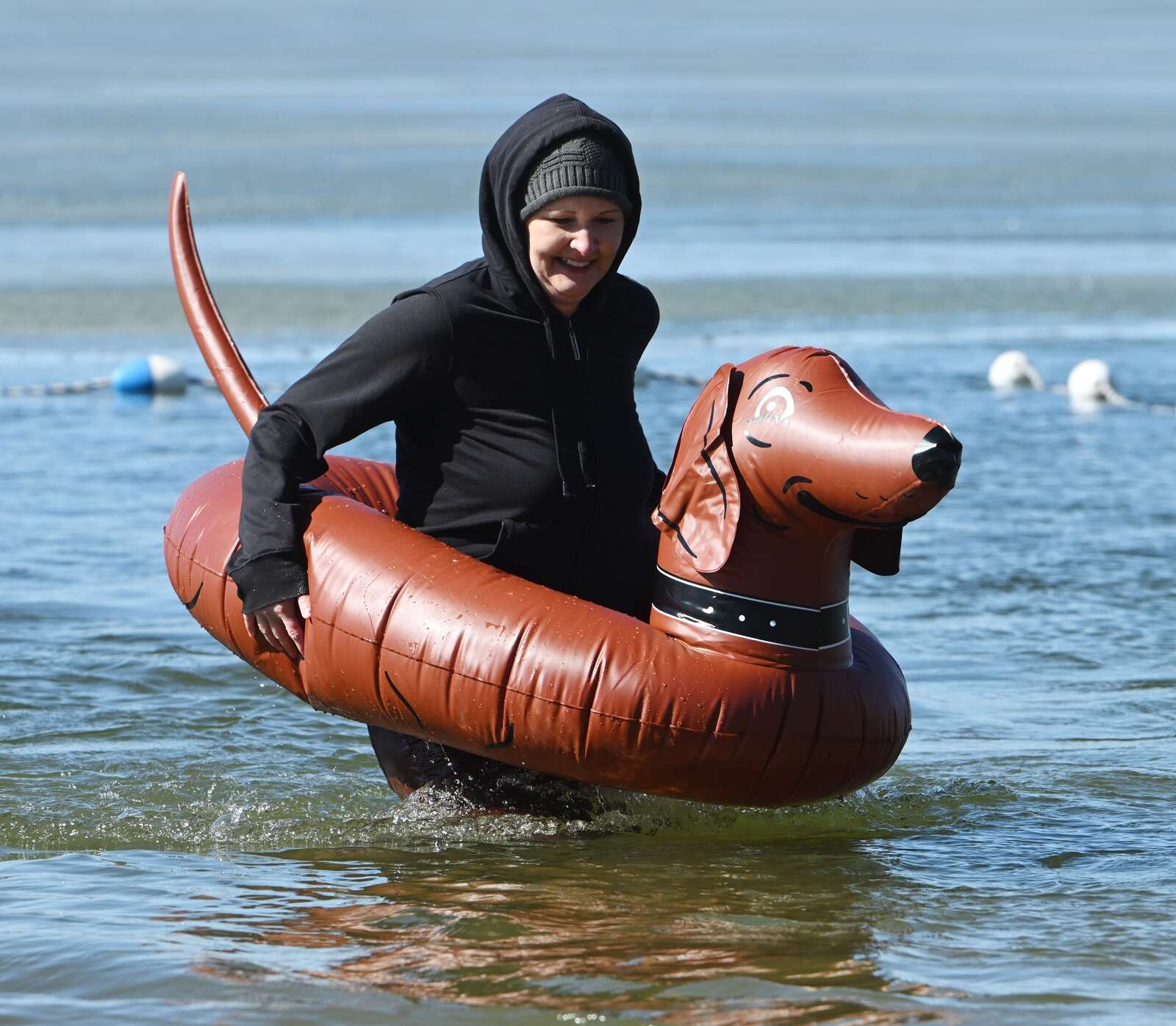 Janelle Konieczski of McHenry and the Chilly Dogs group heads back to shore during the Purple Plunge into Lake Zurich at Breezewald Park on Saturday, March 1, 2025.
