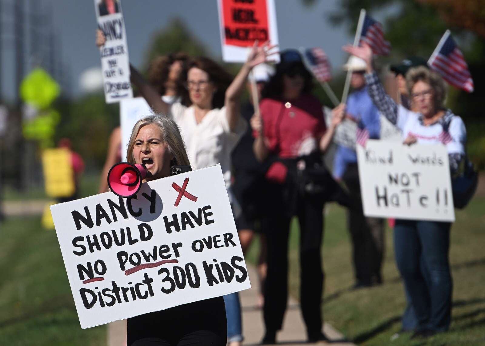 Parent Linda Prestia, left, of Carpentersville, Ill. joined around 60 others Monday, Sept. 15, 2025 at the Community Unit School District 300 central office in Algonquin, Ill. demanding the board president Nancy Zettler resigns following her "karma" comments related to the death of activist Charlie Kirk. The school board voted to remove her from the board president position.