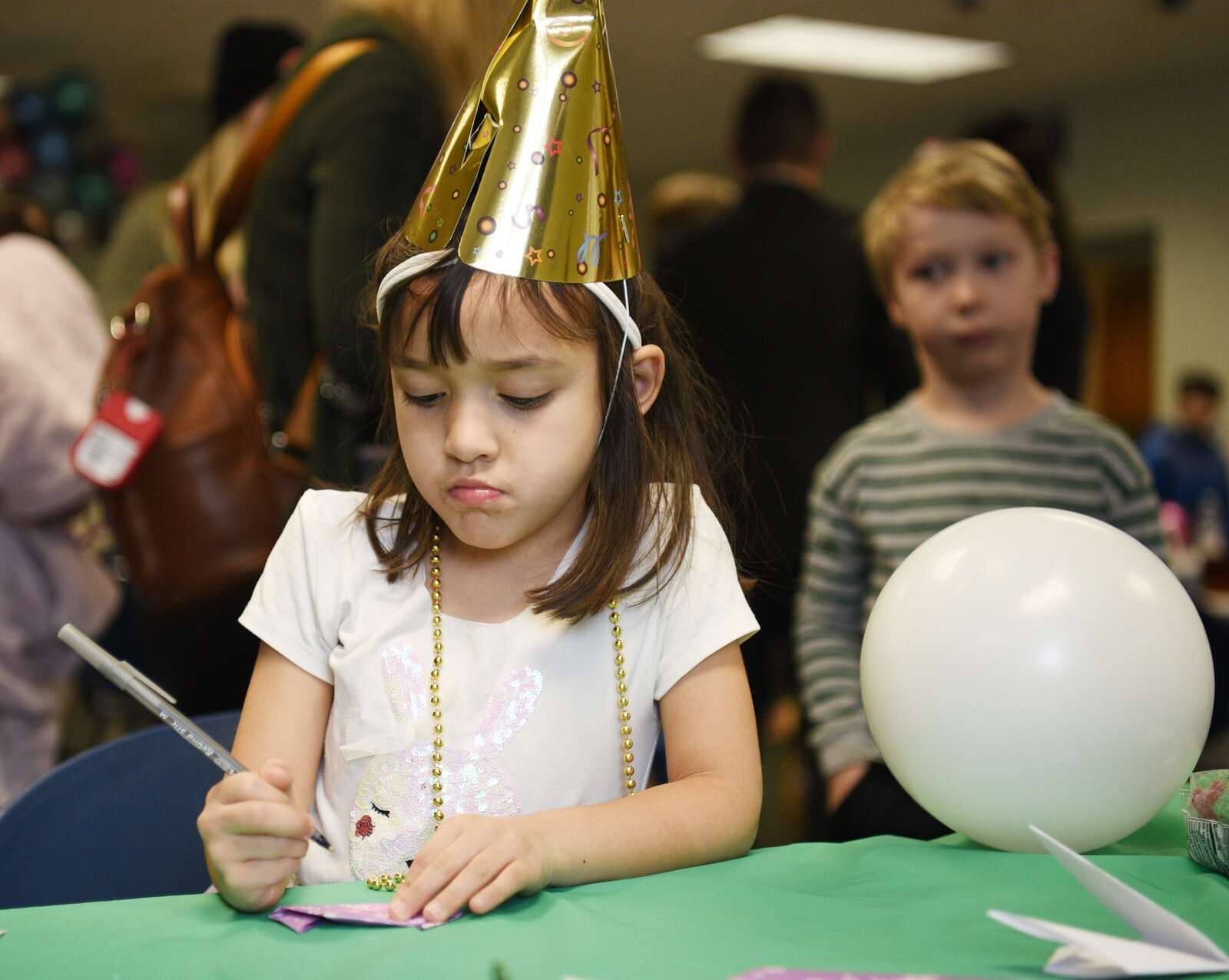 Sofia Nilsen, 4, of Lake Zurich works on a craft project at the Japan-themed table during a New Year’s Eve global celebration at the Ela Town Hall on Tuesday in Lake Zurich. Joe Lewnard/jlewnard@dailyherald.com