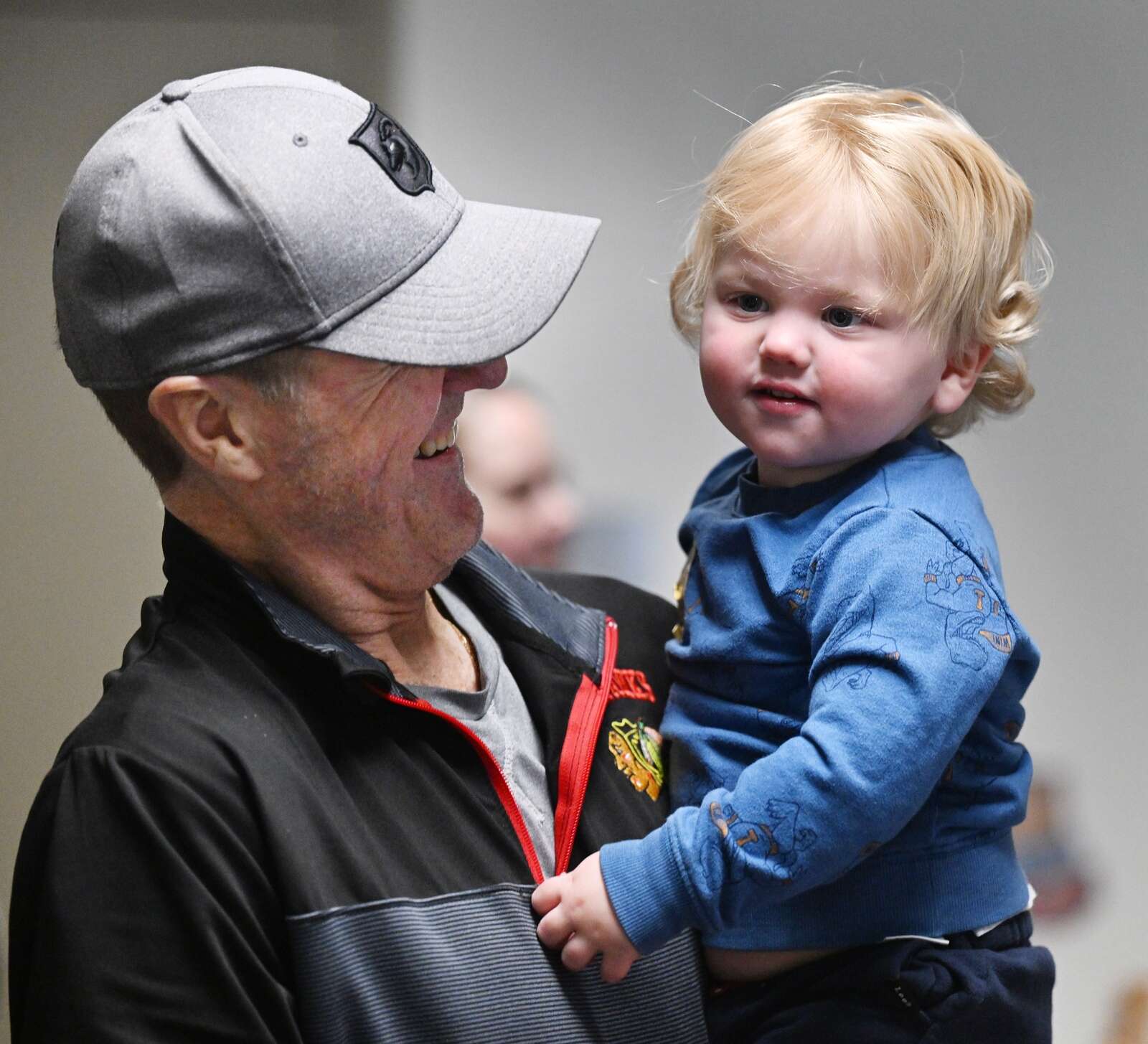 Lachlan Layman, 1-1/2, of Lake Zurich and his grandfather, Tim Travess of Arlington Heights, “dance” to music the during a New Year’s Eve global celebration at the Ela Town Hall on Tuesday in Lake Zurich. Joe Lewnard/jlewnard@dailyherald.com