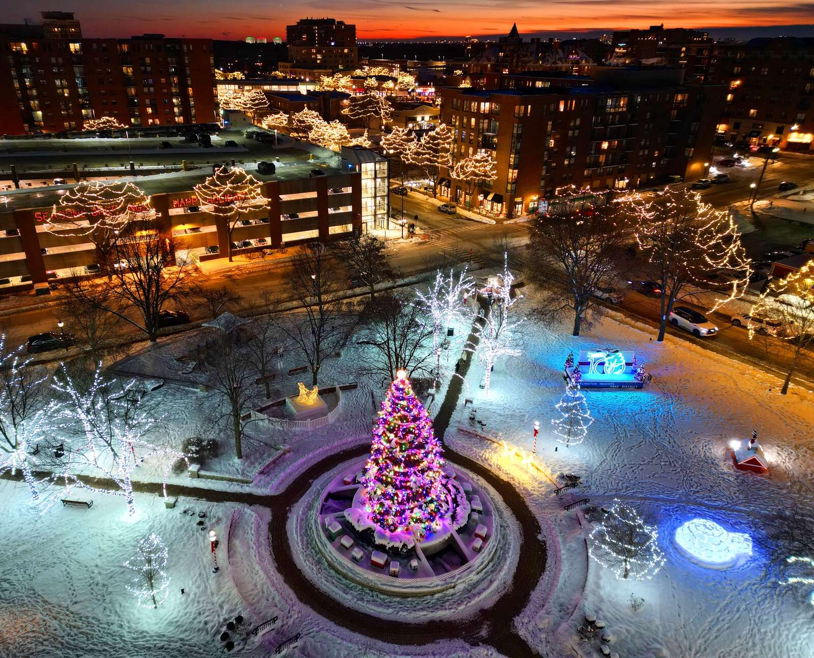 About 150,00 holiday lights illuminate North School Park in Arlington Heights while thousands of others decorate trees around downtown during a cold sunset on Wednesday, Nov. 26, 2025. The Arlington Heights Park District owned North School Park is a destination for families all year with festivals, an amphitheater for concerts, a fountain and playground and room for social gatherings.