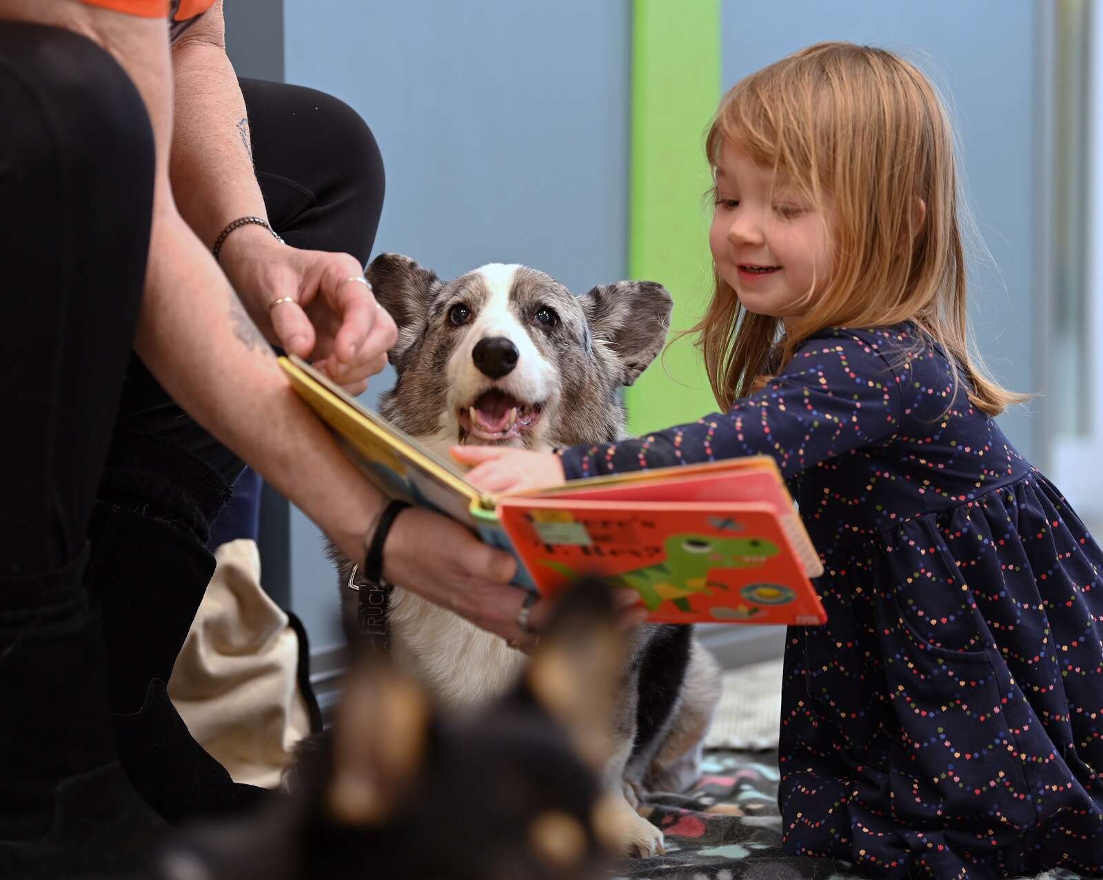 Trucker, 14, a male Cardigan Welsh Corgi breed from South Elgin is being read a story by his handler, Kim Sipple of South Elgin, and on right, Addie Krepps, 2, of South Elgin on Dec. 28, 2025 at the Gail Borden Public Library’s South Elgin branch in South Elgin.