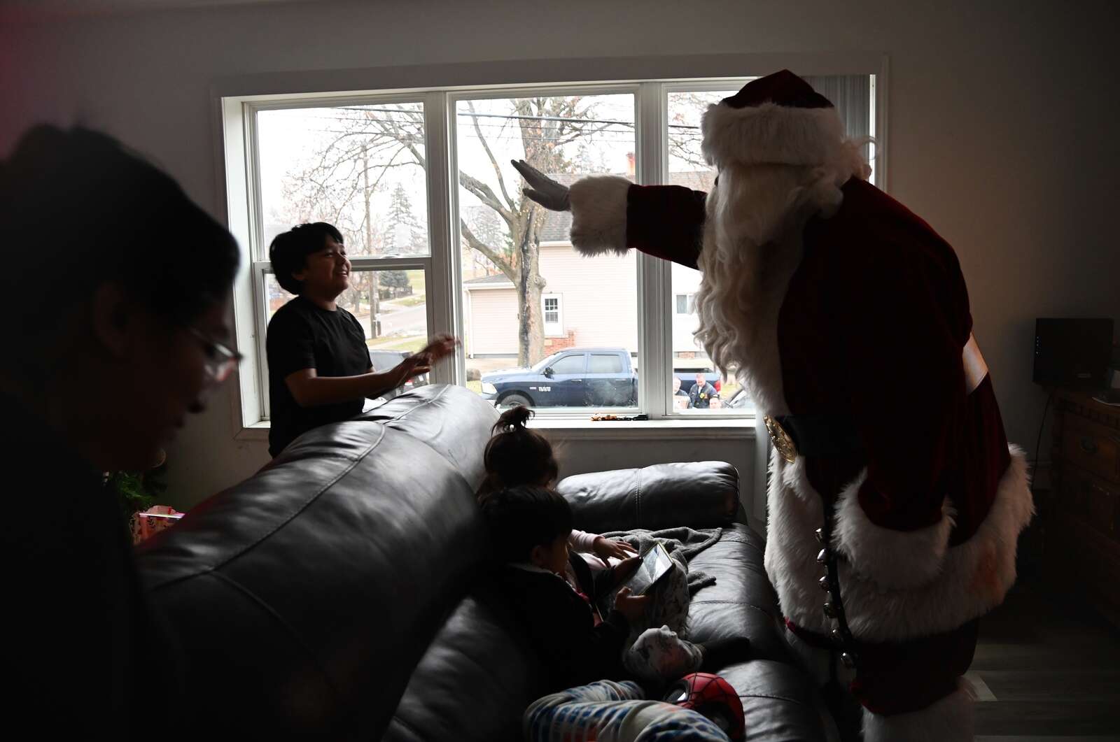 Santa Claus has entered the building to visit the Rufino residence in Elgin on Dec. 25, 2025 and offers a wave to Cande Rufino, 11, a sixth-grader, on Christmas morning.