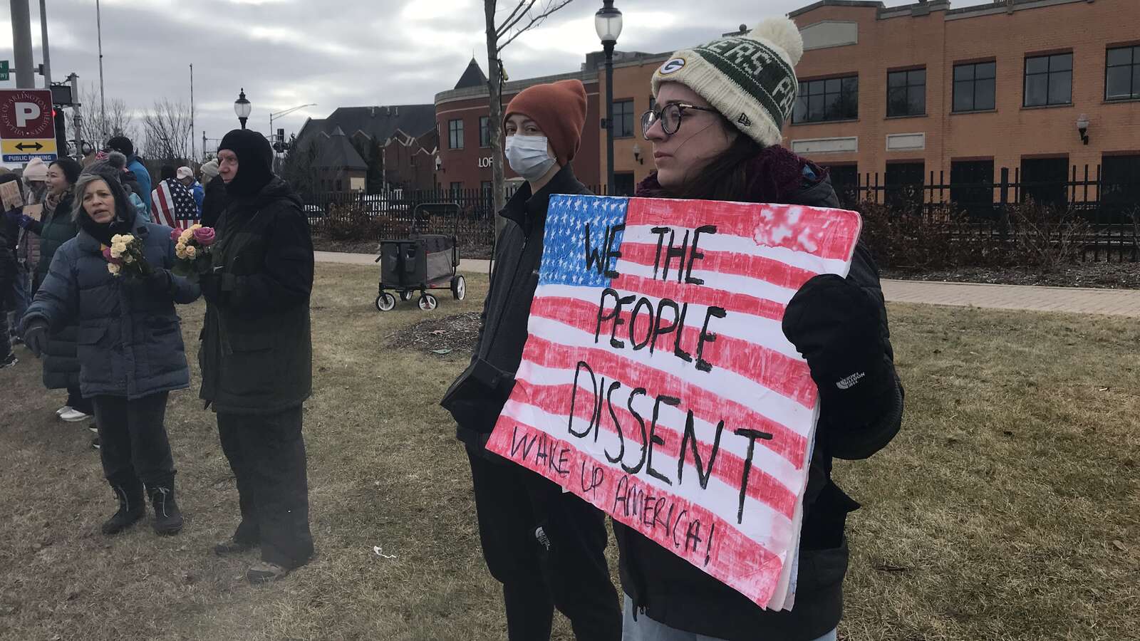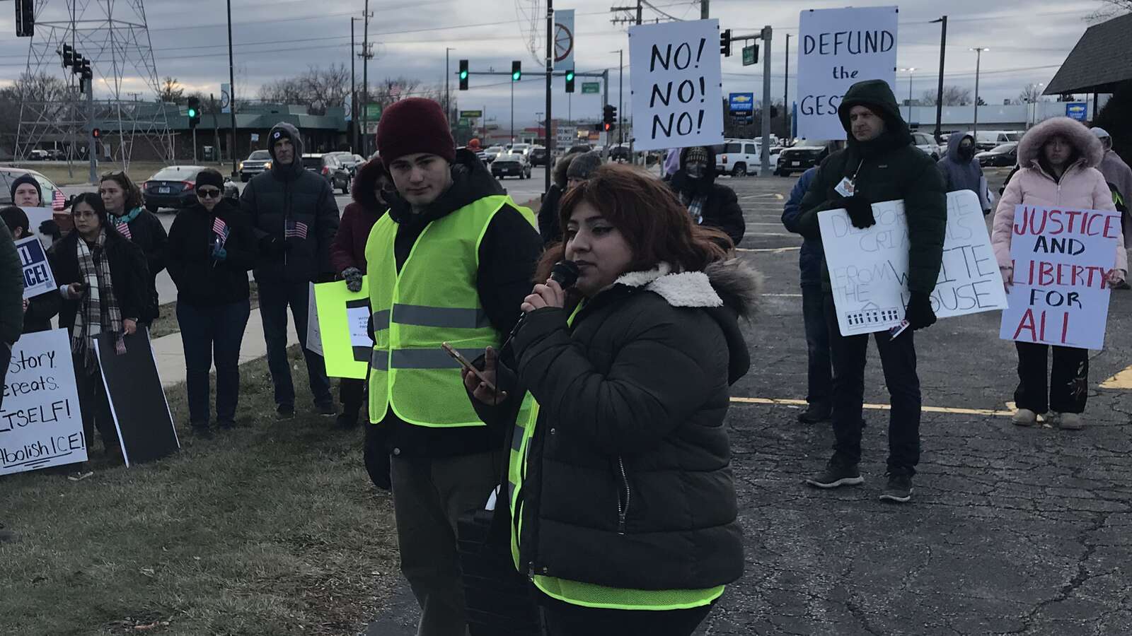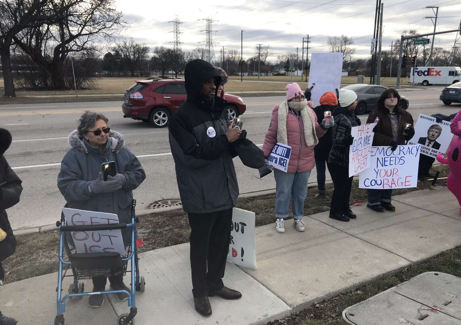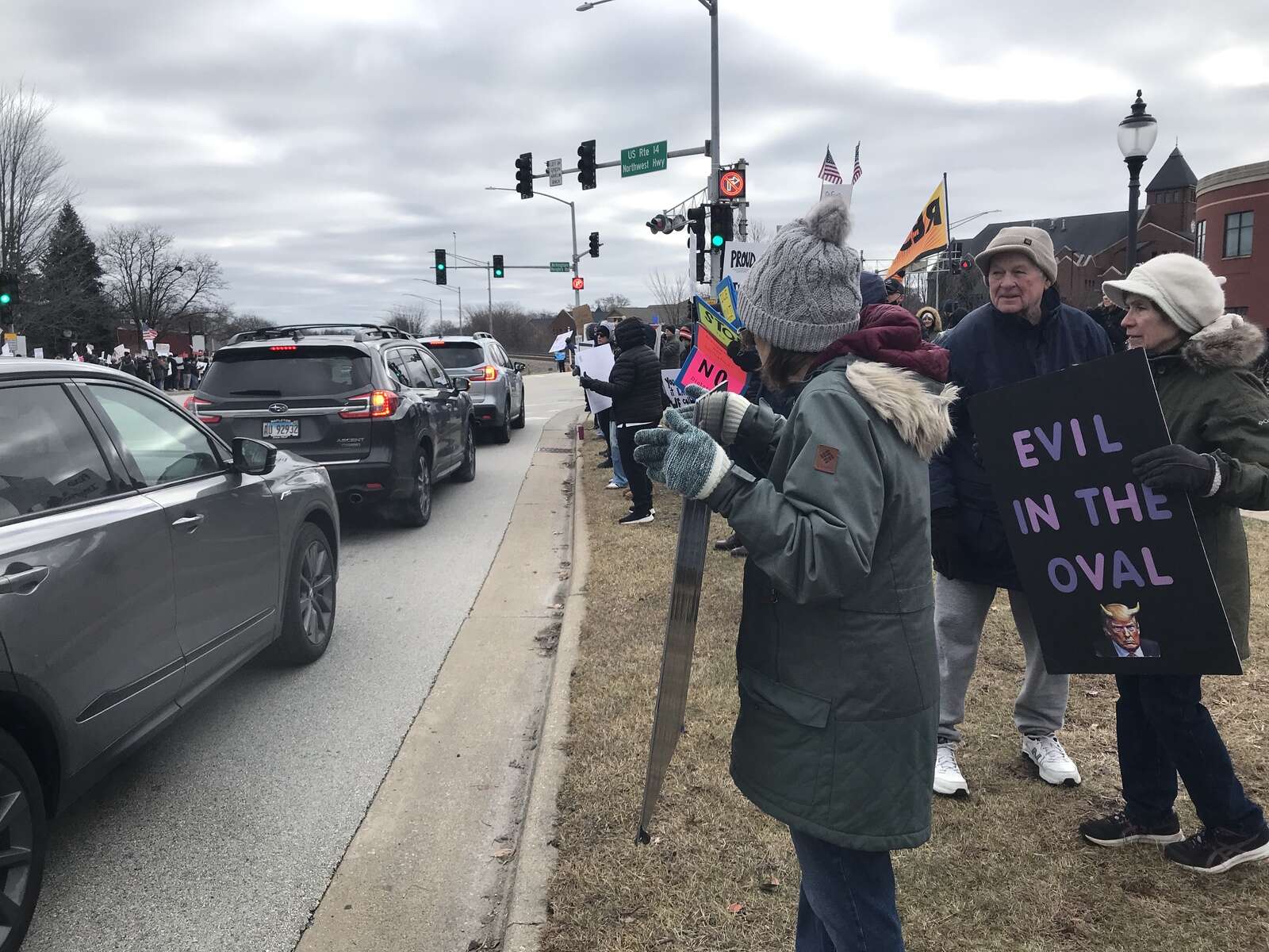 In Arlington Heights, protesters with signs lined Northwest Highway Sunday morning, bundled up against the cold temperatures. Some passing drivers honked their horns in support.