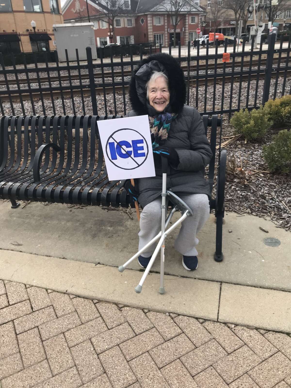 Beverly Palmer, a 93-year-old retired teacher from Arlington Heights, held an anti-ICE sign while seated on a bench. She said she was motivated by anger at U.S. Immigration and Customs Enforcement, the president, “and all his cronies.”