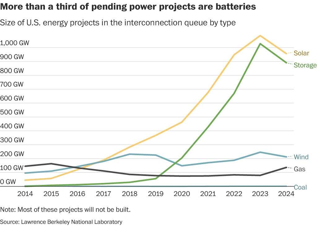 As their prices plummeted over the past decade, batteries overtook natural gas in the interconnection queue, the list of electricity projects waiting for approval to hook up to U.S. grids. Although most projects in the queue are never completed, it gives you a sense of what developers are trying to build: There are six times as many battery projects awaiting approval as there are planned natural gas plants.