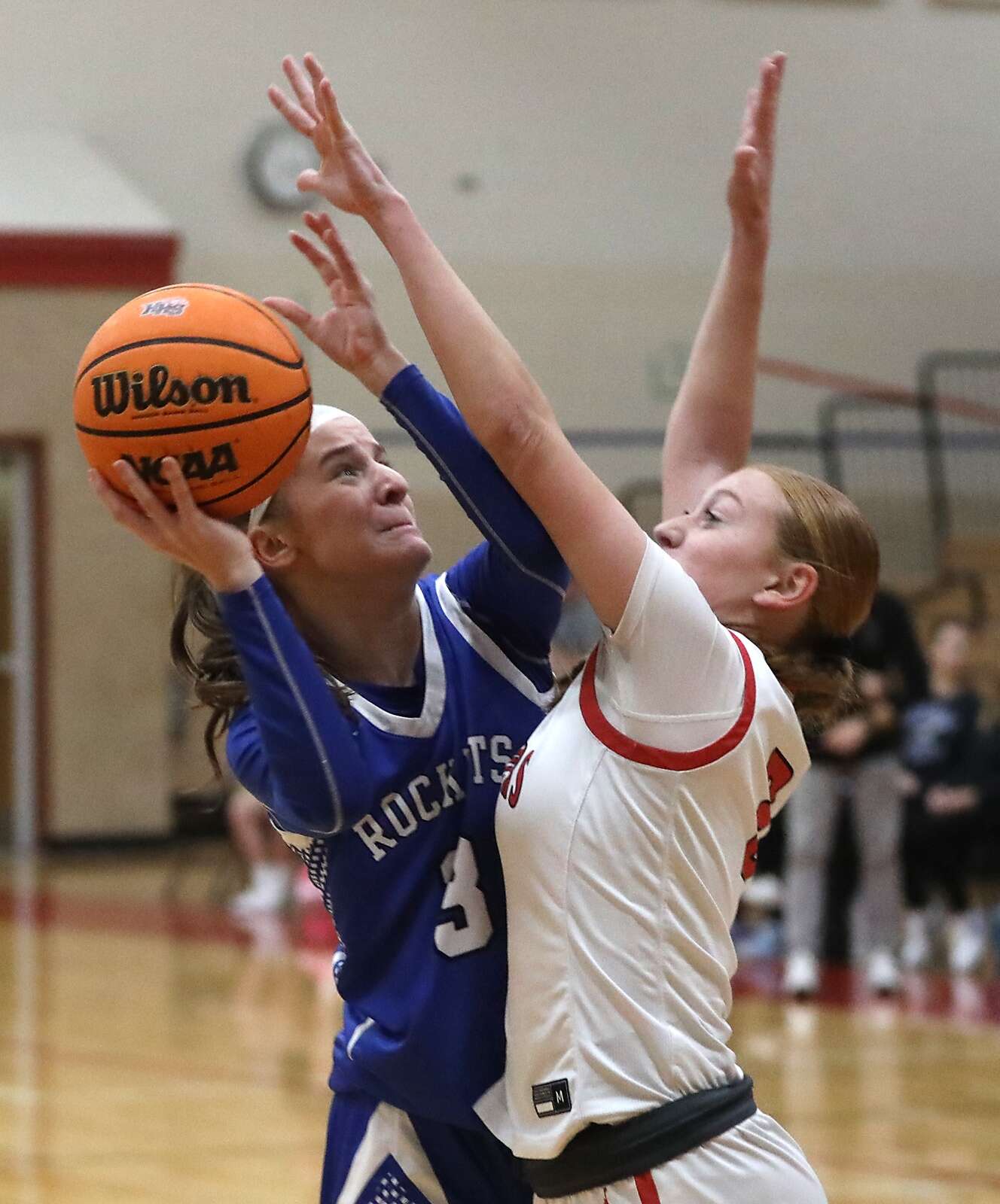 Burlington Central's Julia Scheuer tries to shoot the ball over Huntley's Avery Suess during a Fox Valley Conference girls basketball game on Tuesday Jan. 13, 2026, at Huntley High School. Gregory Shaver — Shaw Media
