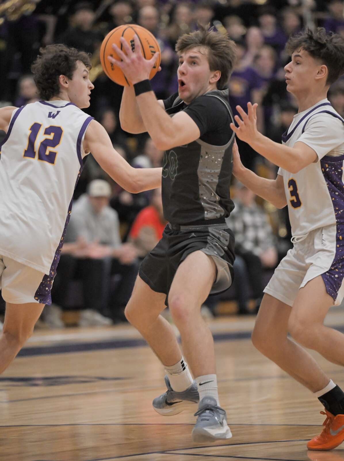 Grayslake Central’s Carson Woods makes a move to get between Wauconda’s Austin Carlsen and Leo Brinias, right, in a boys basketball game in Wauconda on Wednesday, Jan. 14, 2025. John Starks/jstarks@dailyherald.com