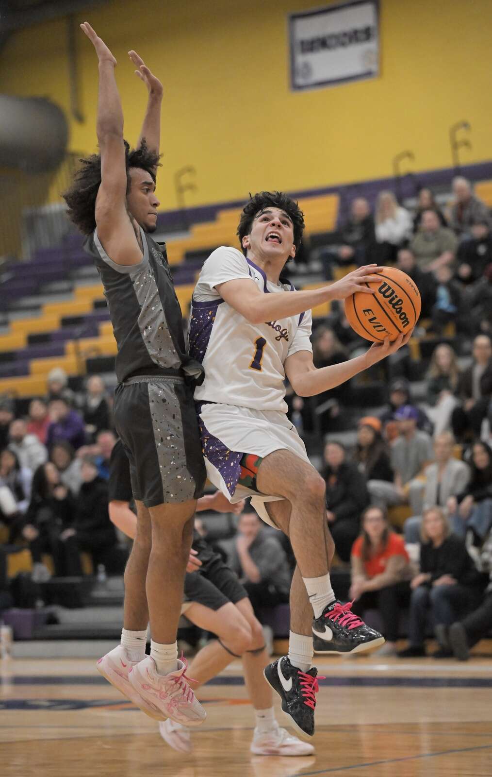 Wauconda’s Alex Ortega shoots despite the dfense of Grayslake Central’s Alex Granville in a boys basketball game in Wauconda on Wednesday, Jan. 14, 2025. John Starks/jstarks@dailyherald.com