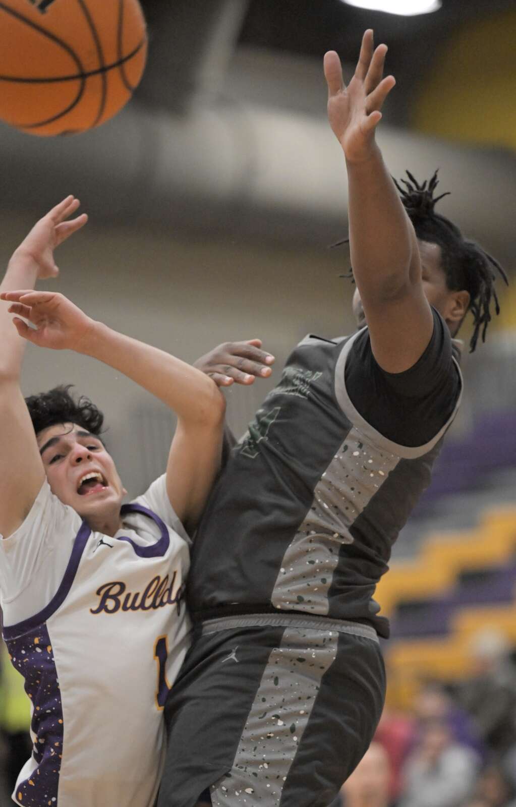Wauconda’s Tony Salemi and Grayslake Central’s Cordell Johnson, right, battle for the ball in a boys basketball game in Wauconda on Wednesday, Jan. 14, 2025. John Starks/jstarks@dailyherald.com