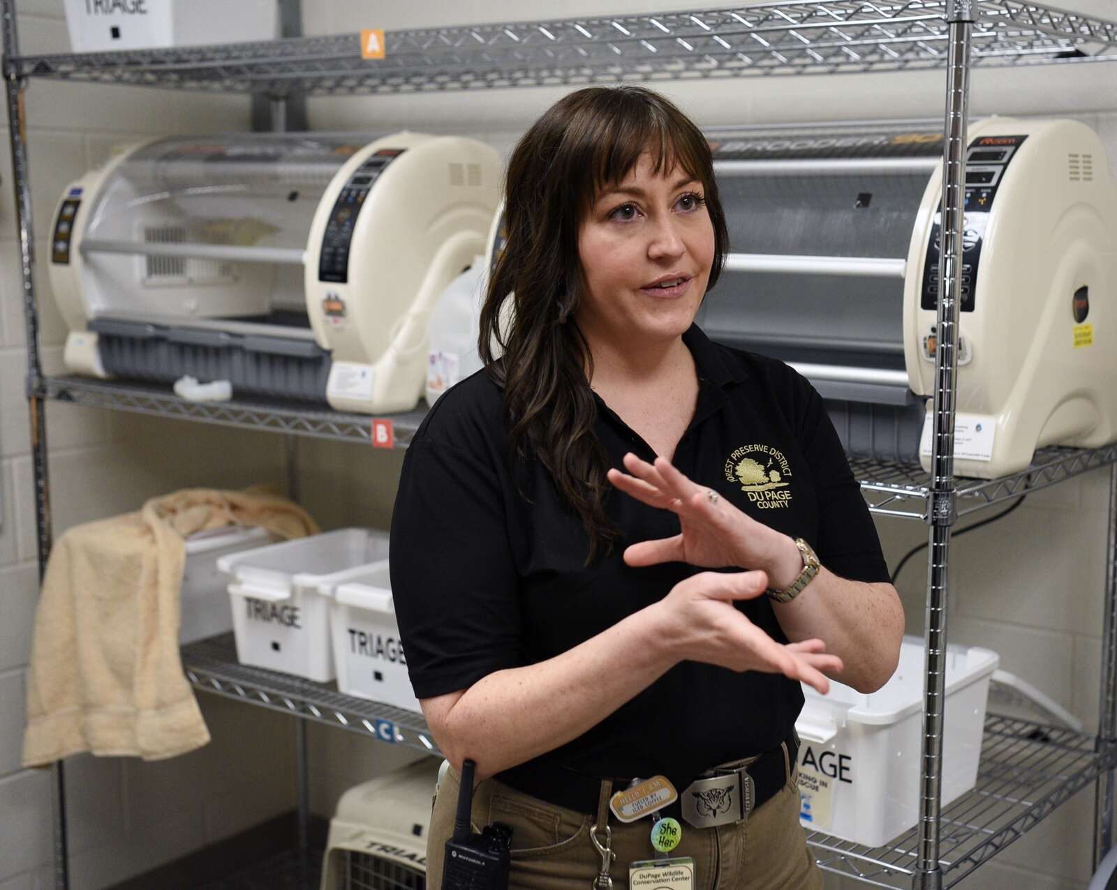Stephanie Touzalin, wildlife education supervisor, talks about a triage area at the DuPage Wildlife Conservation Center in Glen Ellyn. Joe Lewnard/jlewnard@dailyherald.com