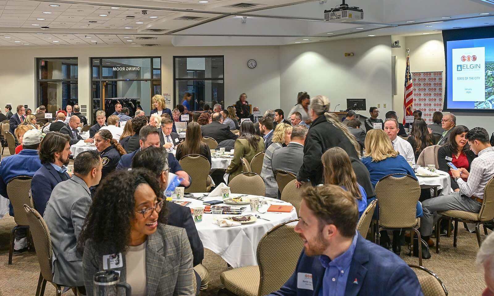 About 200 business leaders and community members packed the room Wednesday at Elgin Community College for Elgin Mayor David Kaptain’s annual State of the City address. Courtesy of the city of Elgin