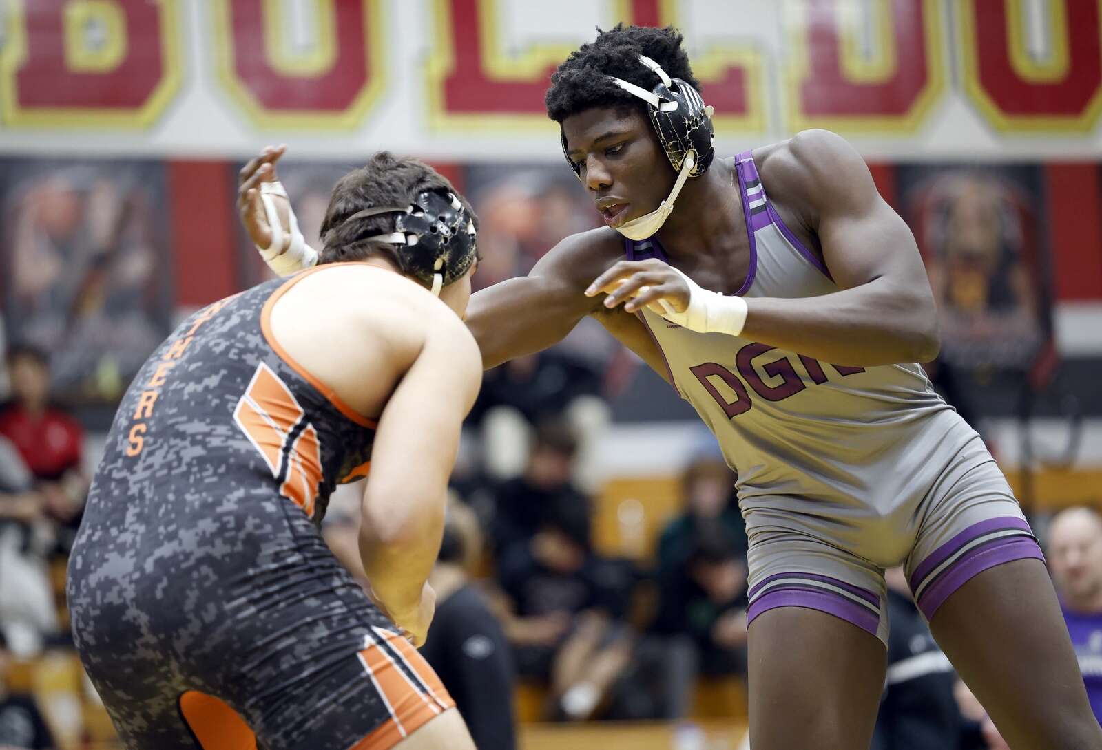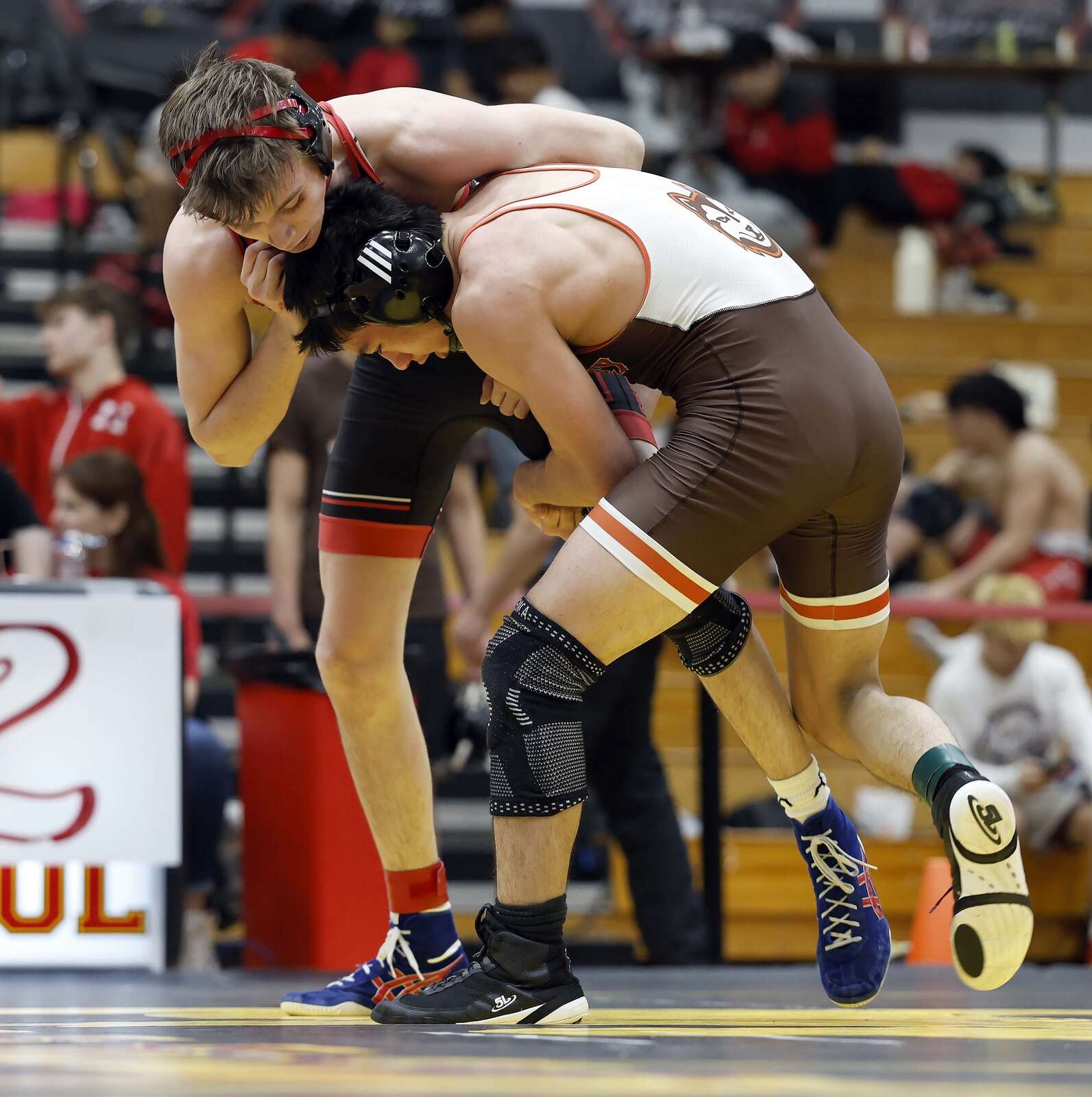 Nate Olona of Downers Grove North wrestles Josh Hoffer ofWashington at 215-pounds during the Clint Arlis Invitational boys wrestling invite Saturday, Jan. 17, 2026 in Batavia. Brian Hill/bhill@dailyherald.com